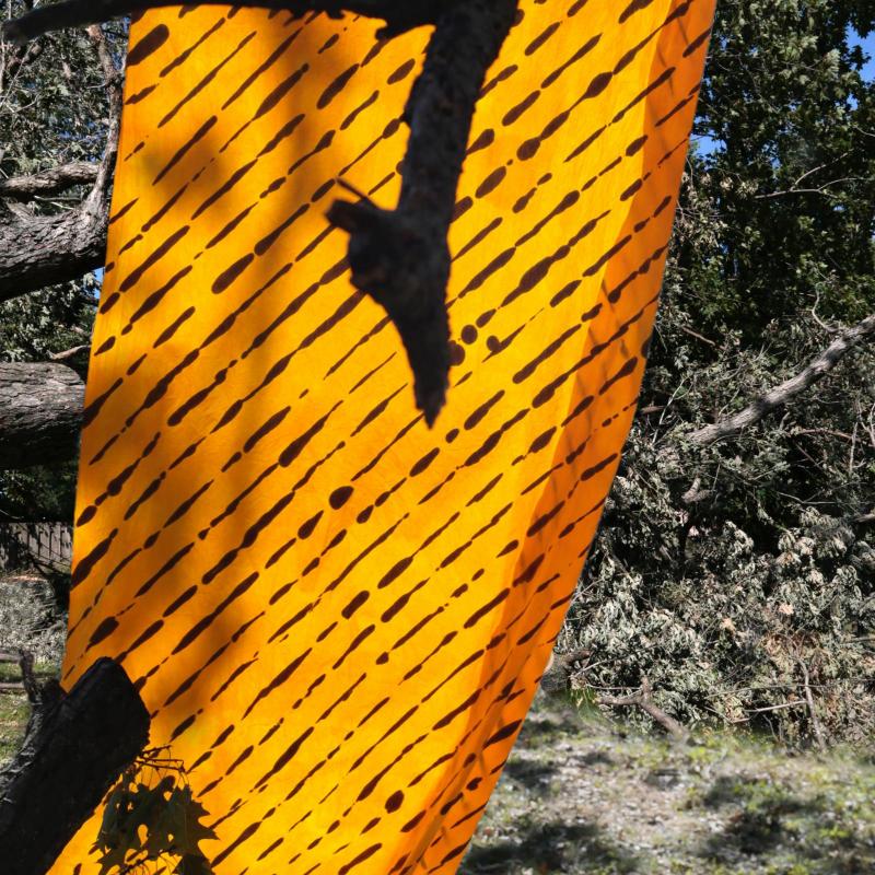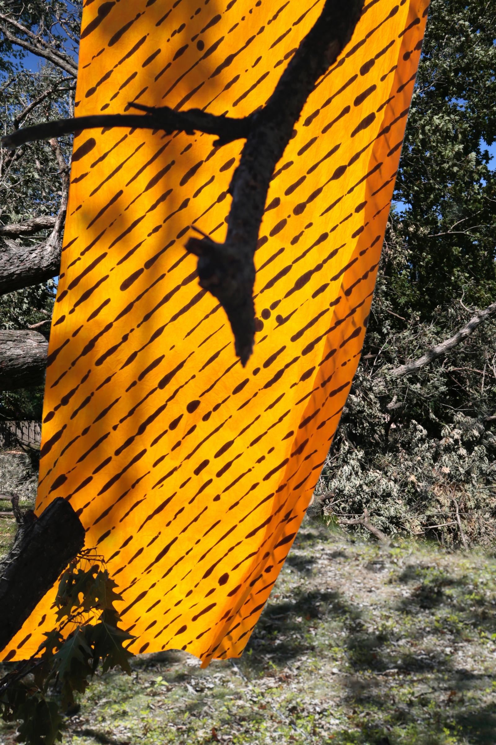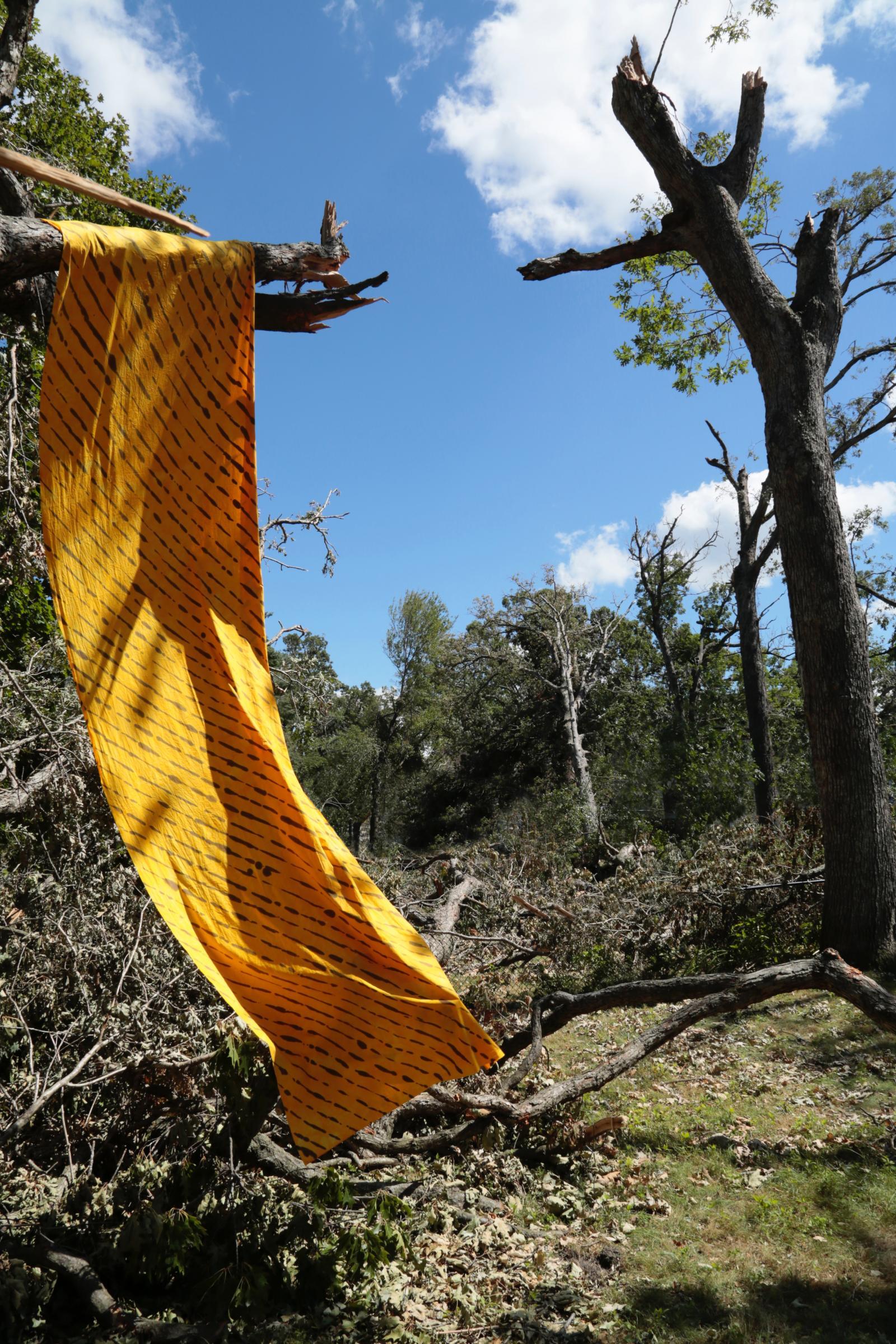 What does an oak feel when it is blown down? On August 10, 2020, 150+ year old oaks in our yard were felled by hurricane force winds. These trees had witnessed earlier inhabitants of our forested land and the growth of our homes and families. I imagined they would weep for the loss of their beauty and their place as sentinels of our history. I laid a piece of fabric on the grass, dyed it in situ and hung it from a limb that only a few days earlier had soared into the air, watching over us. The tree’s tears joined with ours as we mourned the loss of our glorious friends.