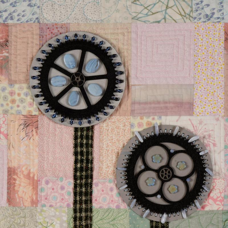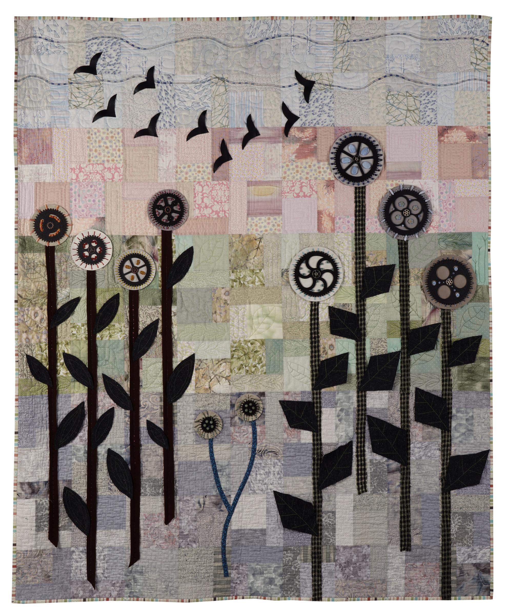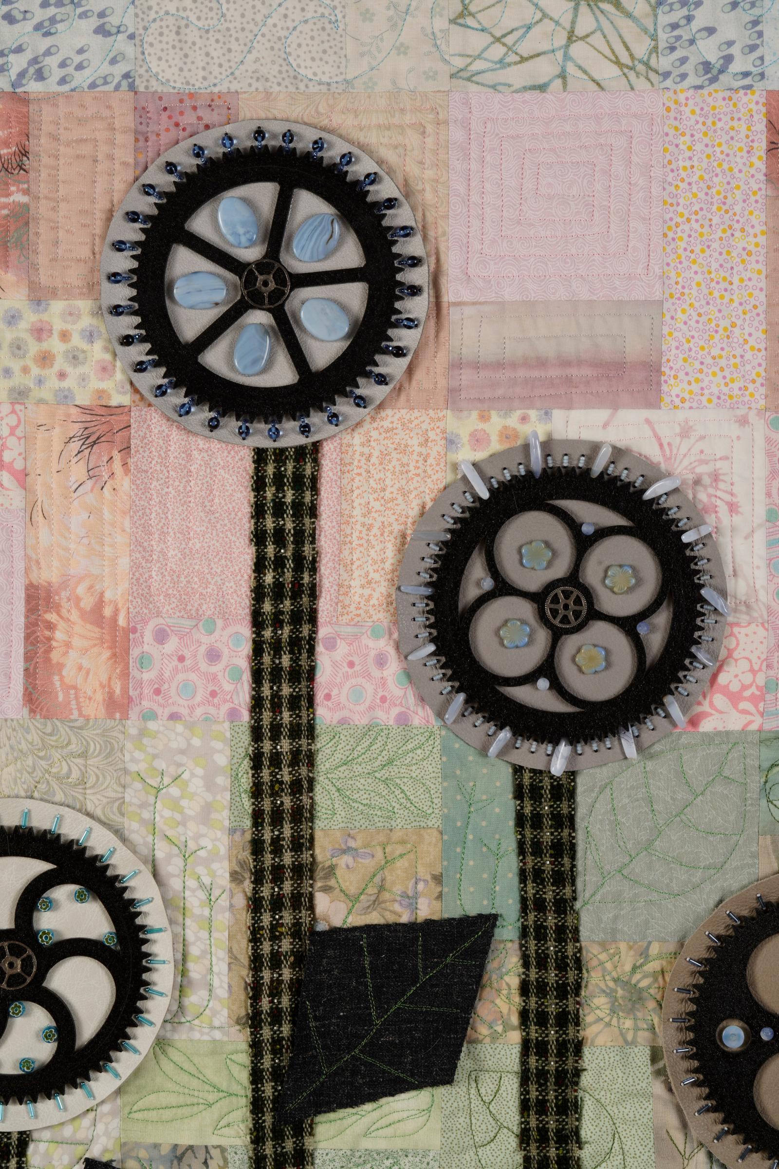 My quilt celebrates the makers in Steampunk. Steampunk often portrays the era as gritty, dark, and filthy, but also with makers who are experts at creating and repairing. Imagine a garden that grows all the parts one needs, continuously supplying gears to replace those that wear down over time. Instead of the usual depictions of sooty industrial neighborhoods, imagine colorful gardens at each house, producing parts that would allow one to invent new things, or extend the lifetime of the most useful objects.