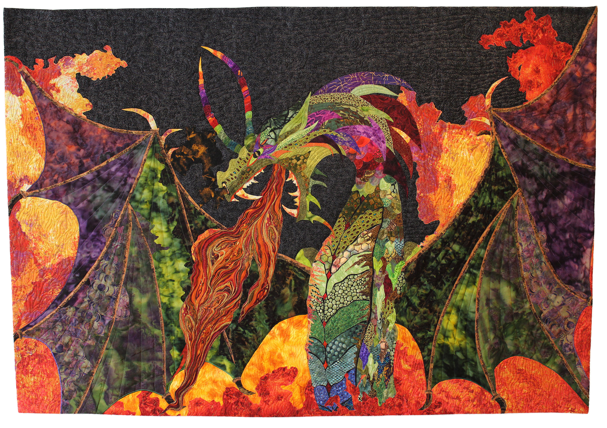 The piece is fused, machine appliqued, and machine quilted on my home machine. I tried to let the fabric create light and shadow. I sued a crystal to bring the dragon's eye to life. I used an artistic binding to enhance the expanse of the wings.