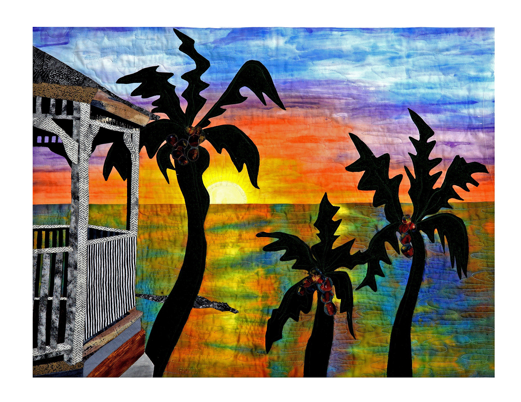 This is a combination of appliqued purchased fabrics and artist painted fabrics. It was fused then machine appliqued and quilted.