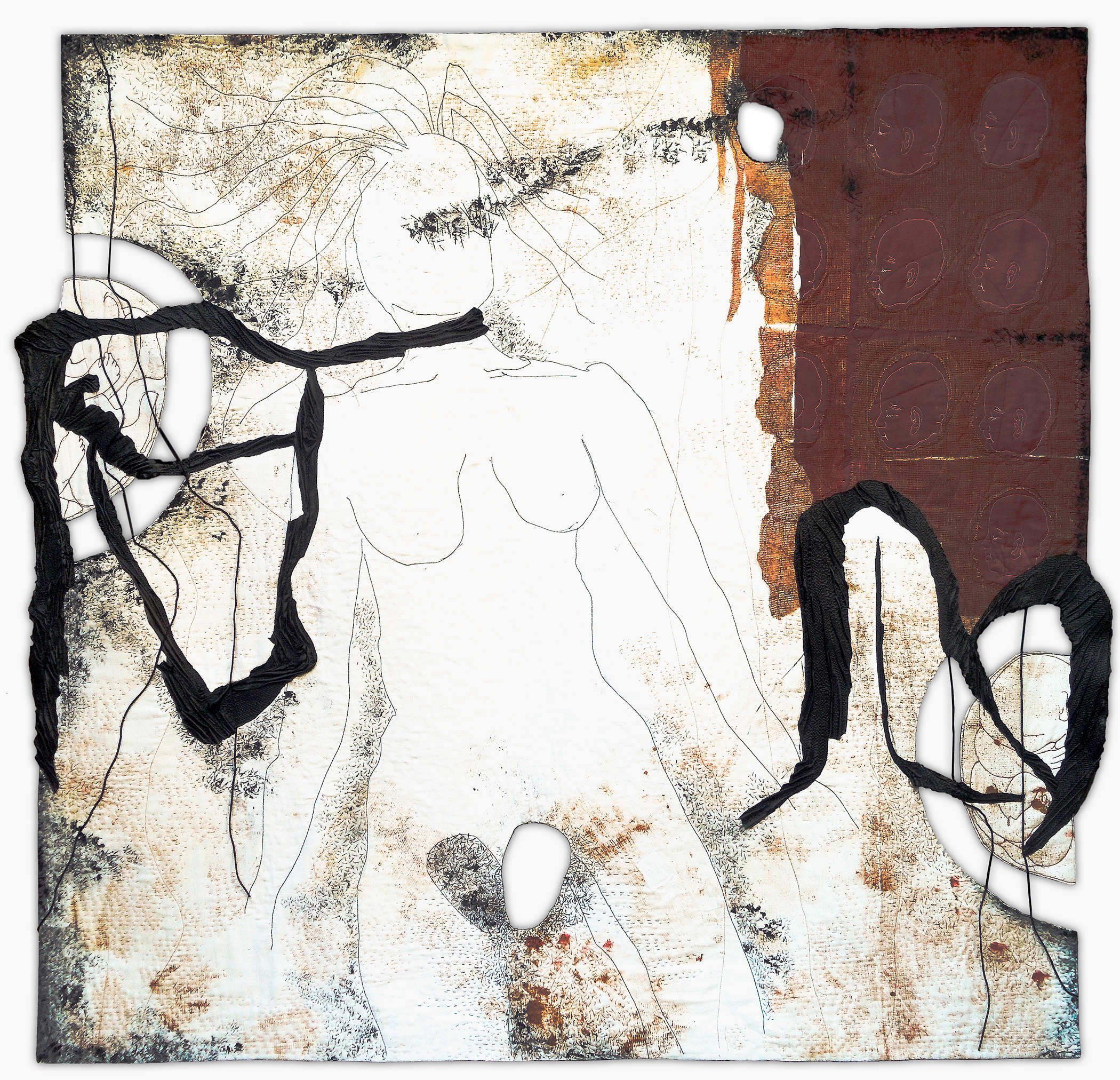 Her work should not only be beautiful or nice or pretty and cute. The subject is the driving force for her pictorial language and determines the technique, colours and structures she will use. Brigitte Kopp works in series based on different themes. She dedicates herself as an observer of her environment. In the last years most of her textile collages where based on social themes, on people, their environments and their relations, to show the invisible connections we become aware of only upon reflection.