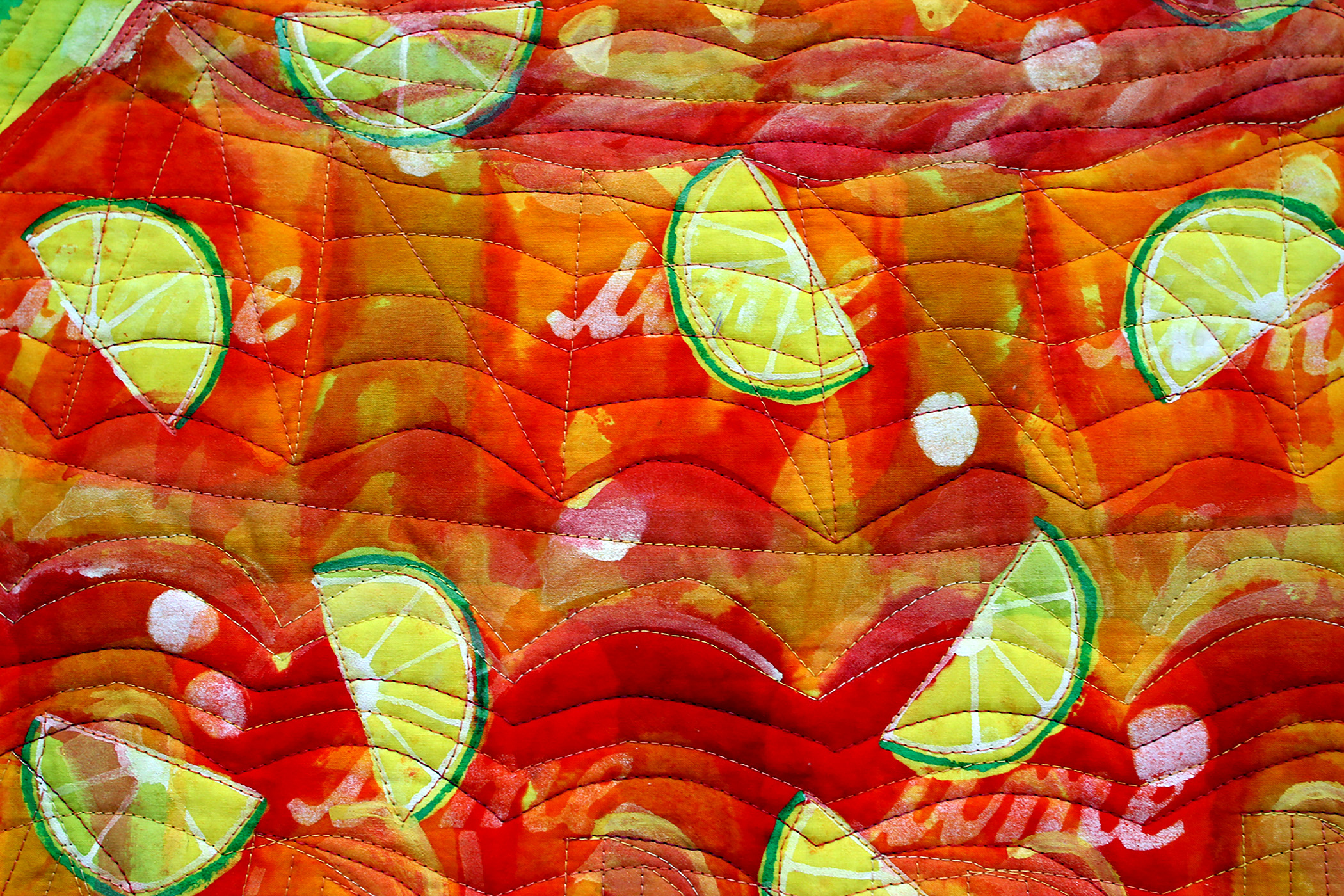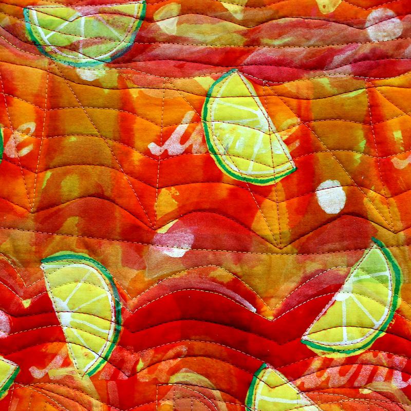 Dyed, soy wax batiked, painted, screen printed, stenciled, machine quilted