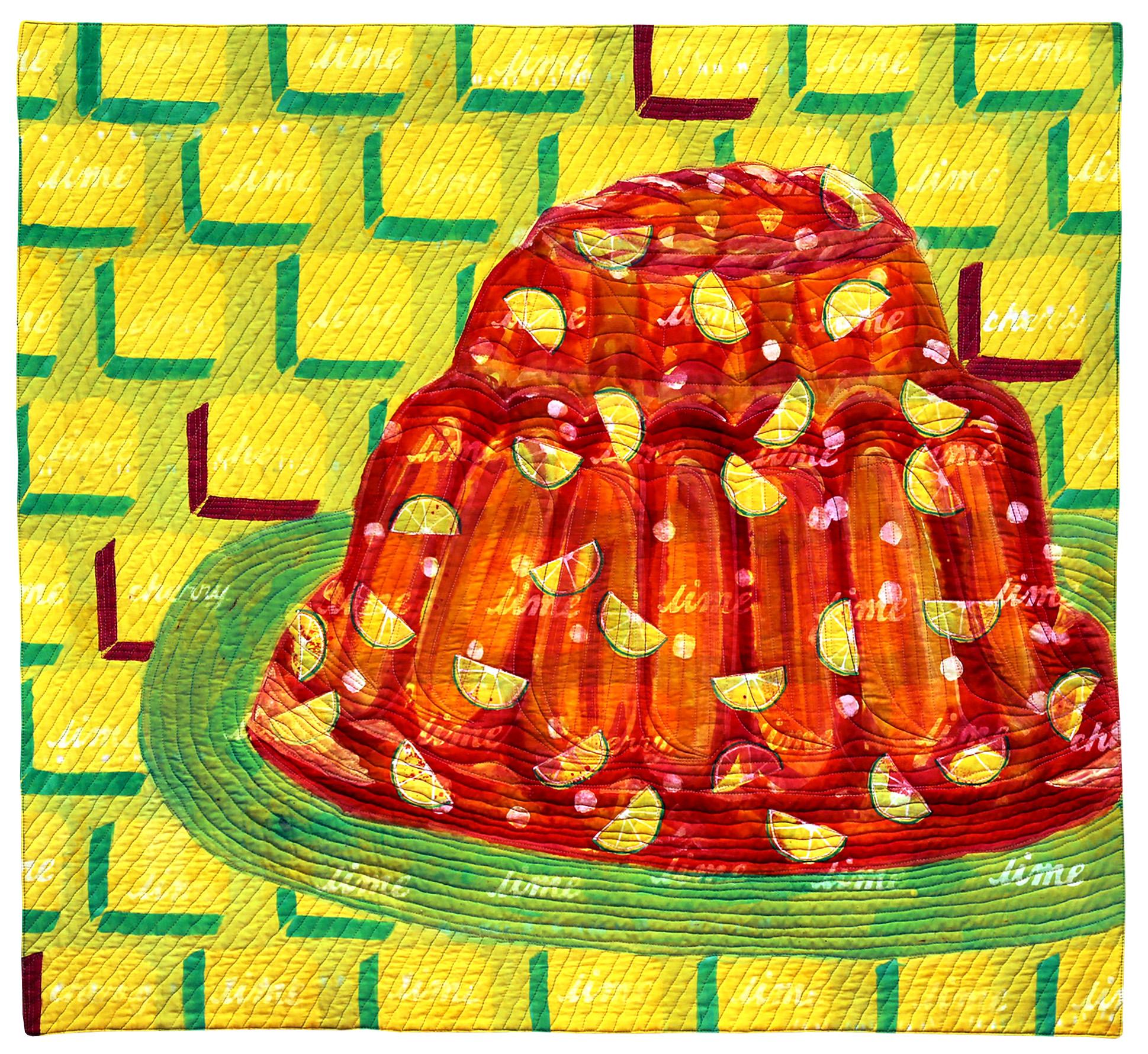 I am fascinated by the way we adapt to change and are continually reconfigured by our experiences and the world’s influences. This piece relates to our intimate relationship with food, including its role in celebrations and personal relationships. I’ve discovered new food traditions in Idaho and Utah, where gelatin is served as both a salad and dessert. Utahans consume twice the amount of lime gelatin (the official state snack) as any other place on the planet. I am intrigued by this intense love of cheery, bright, and unnaturally colored gelatin. Gelatin Dessert Delite is inspired by wonderful vintage cookbooks that incorporate gelatin into every course of a meal and social situation. I pay homage to the gelatin mold in all of its colorful glory!