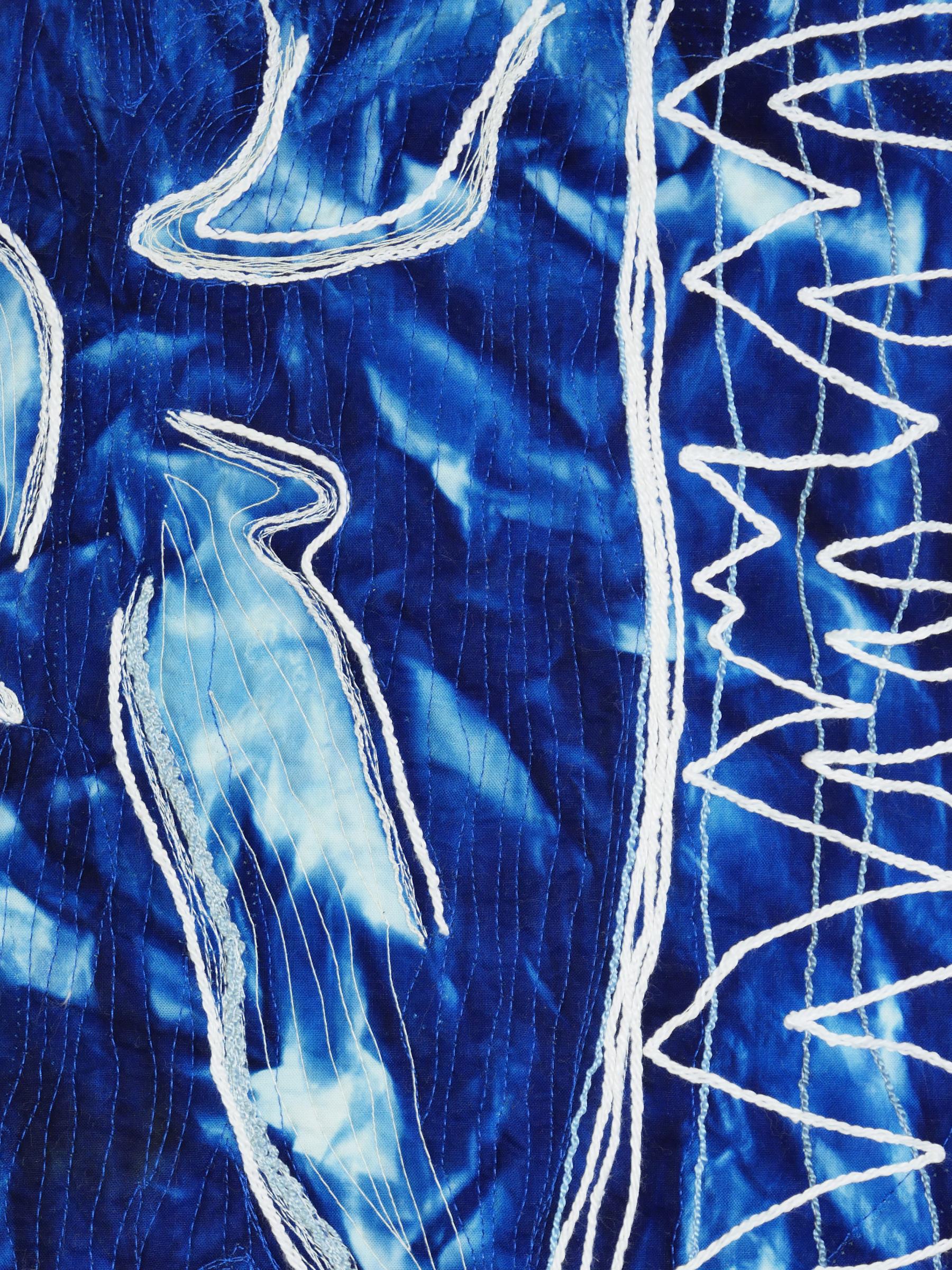 My piece captures the frozen beauty of the glacial crevasses of Aotearoa (New Zealand), using the rich, deep blues created with cyanotype. The fabric is colored by combining the cyanotype process with hand dyeing methods. The couched stitching lines mimic the rough, jagged edges of the crevasses. As glaciers continue to melt and silently fade from view, let Glacial Blues inspire us to continue our efforts to protect these and other natural wonders before they disappear.