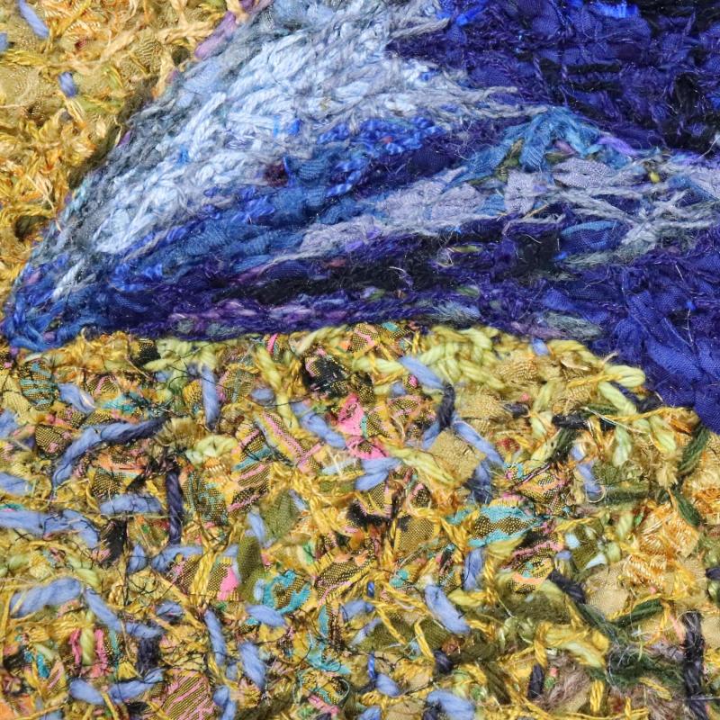 The image is created by surface weaving, an original technique that allows marks unconstrained by the warp-weft directionality of a conventional loom. The process generates myriad broken colour interactions and textures, each a little sculptural vignette of its own. At close viewing range, these micro-abstractions clearly depart from the realism of the overall image. At the same time, together they evoke a felt sense of the real shifting light, complexity, and liveliness one can experience in nature.