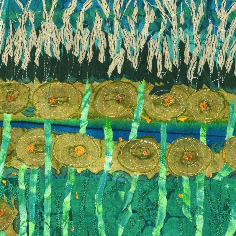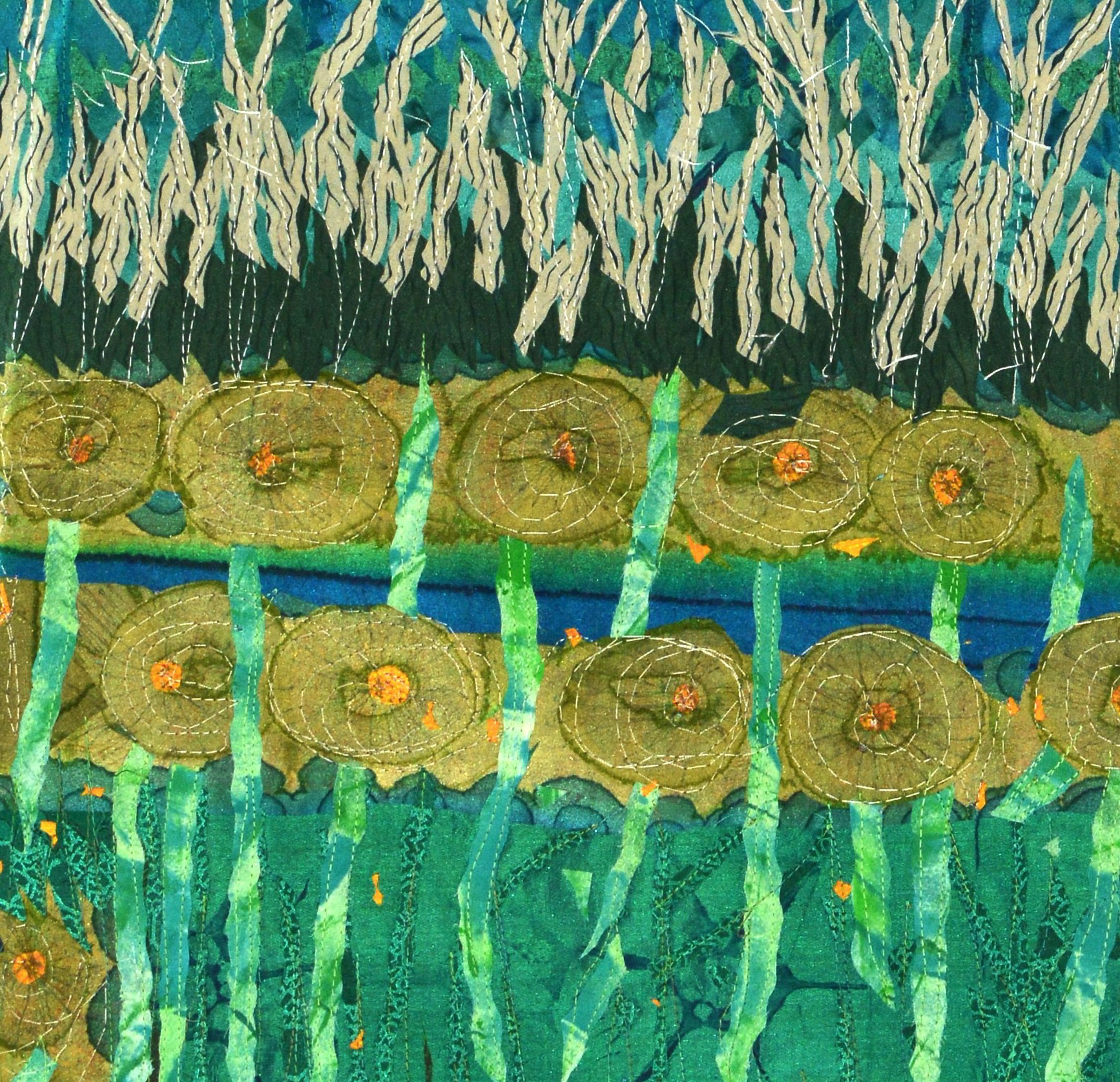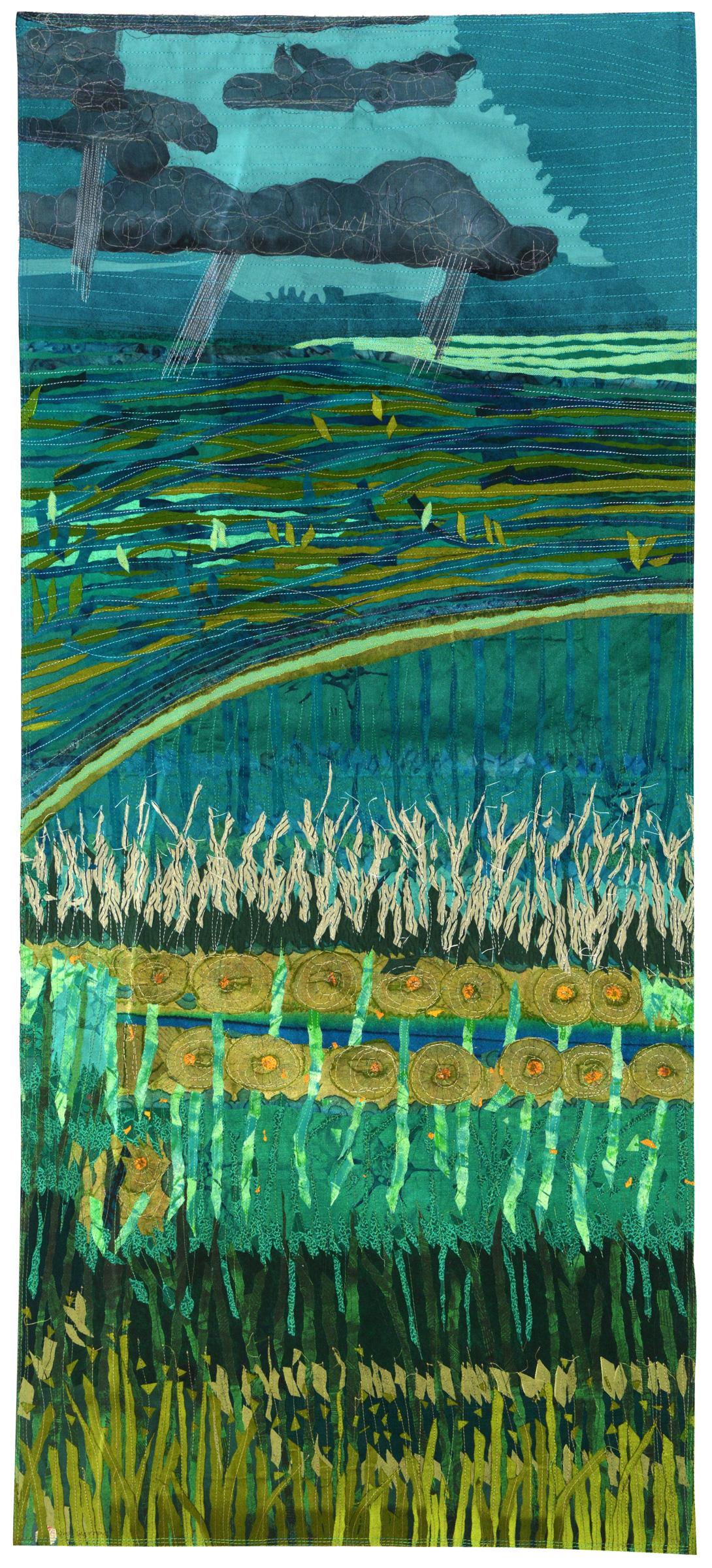 Commercial and recycled cloth, fused appliqué, and machine stitched.