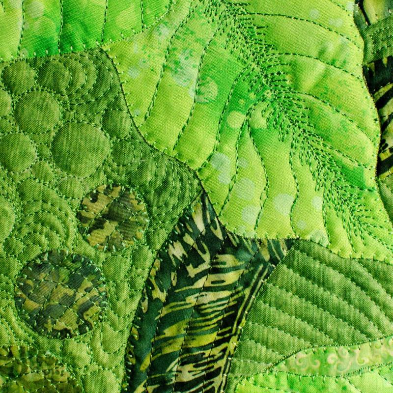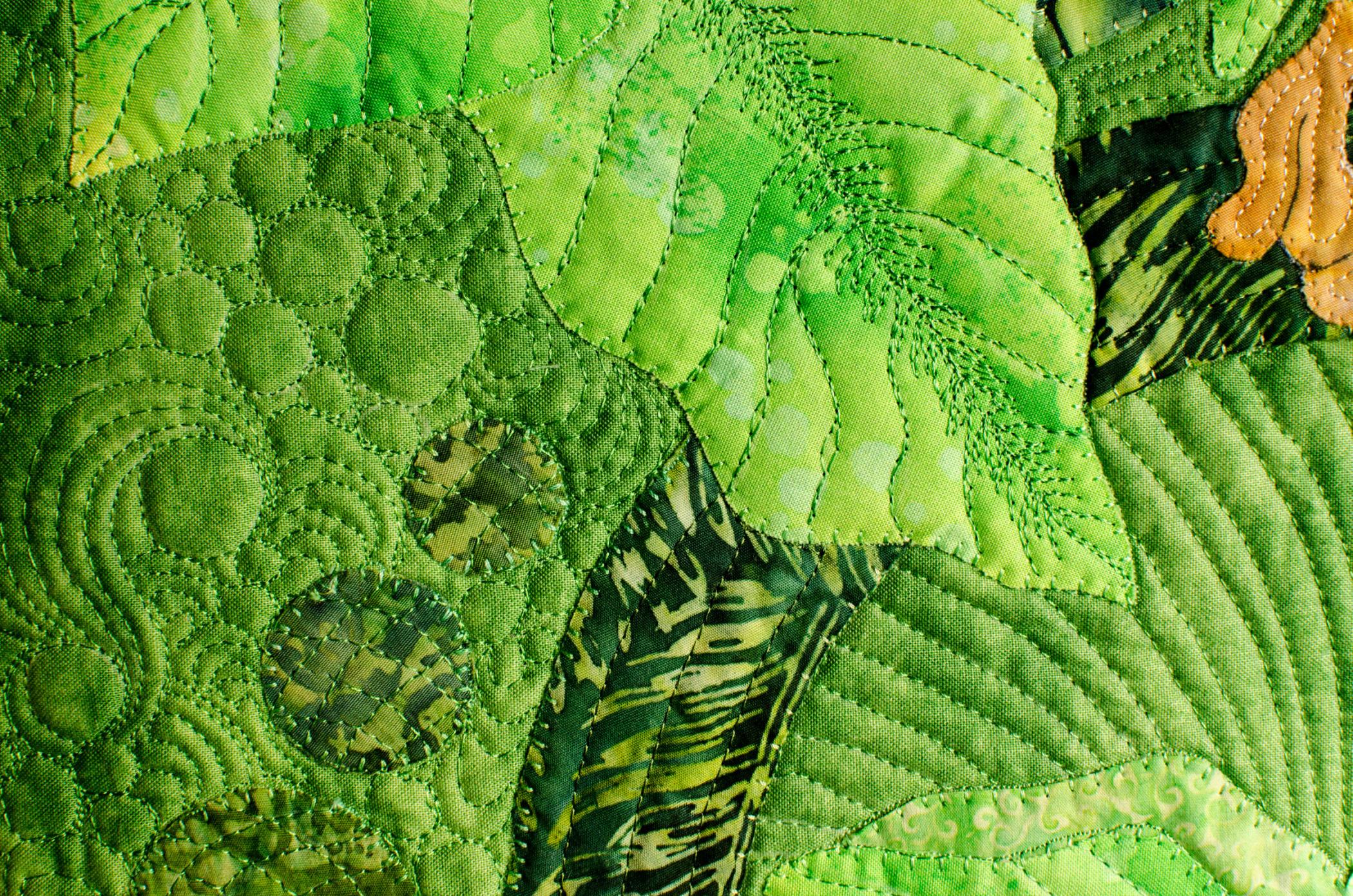 The quilt was made with different values of green cotton, some batiks, some without much contrast, to allow you to study and find hidden meanings.