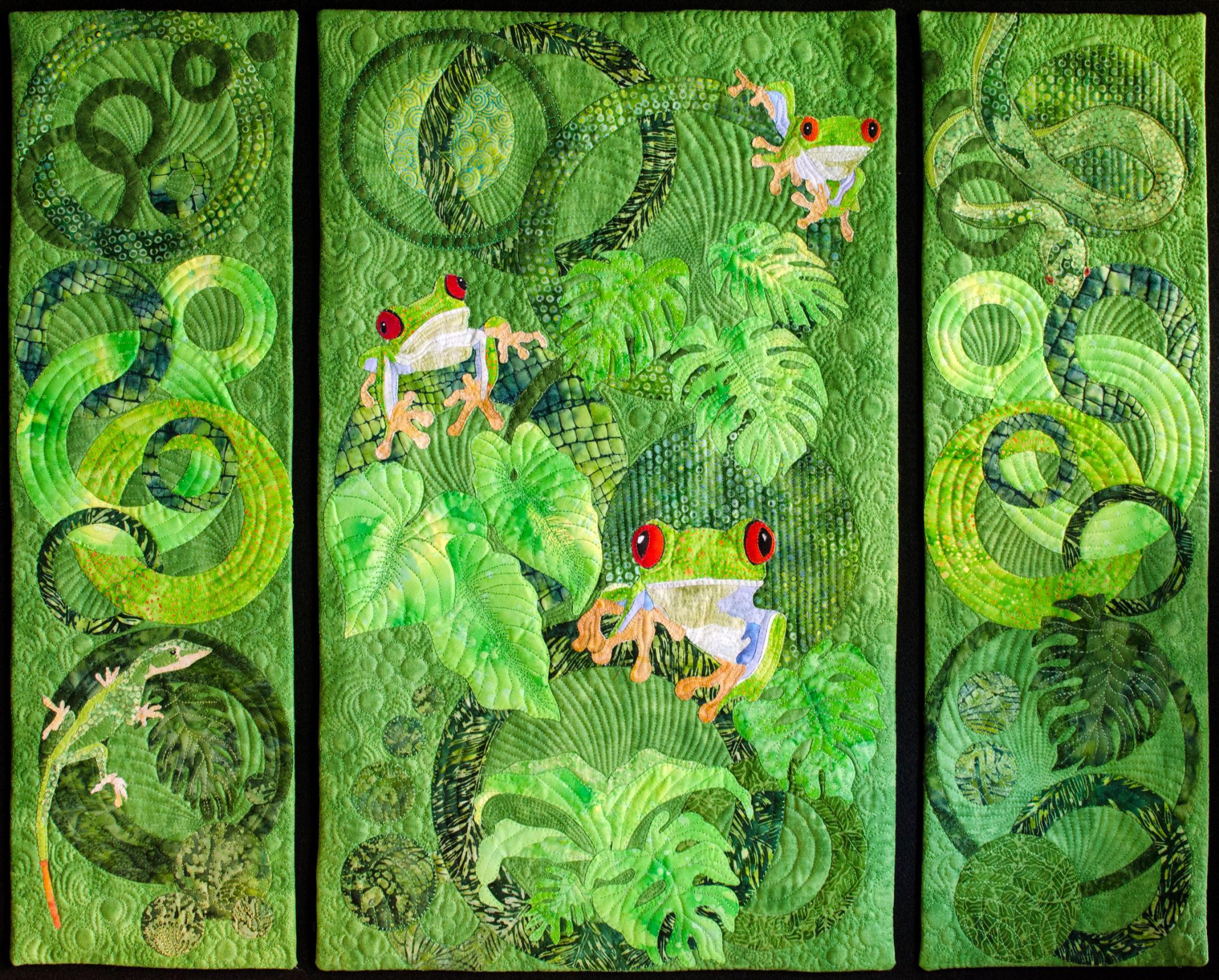 This quilt's design and green color was made to emphasize the need for environmental concern for the incredible beauty of flora and fauna in the rainforests. Along with the emphasis on saving the plants and animals themselves, it's also important for the not so evident future medical cures that might be discovered through nature.