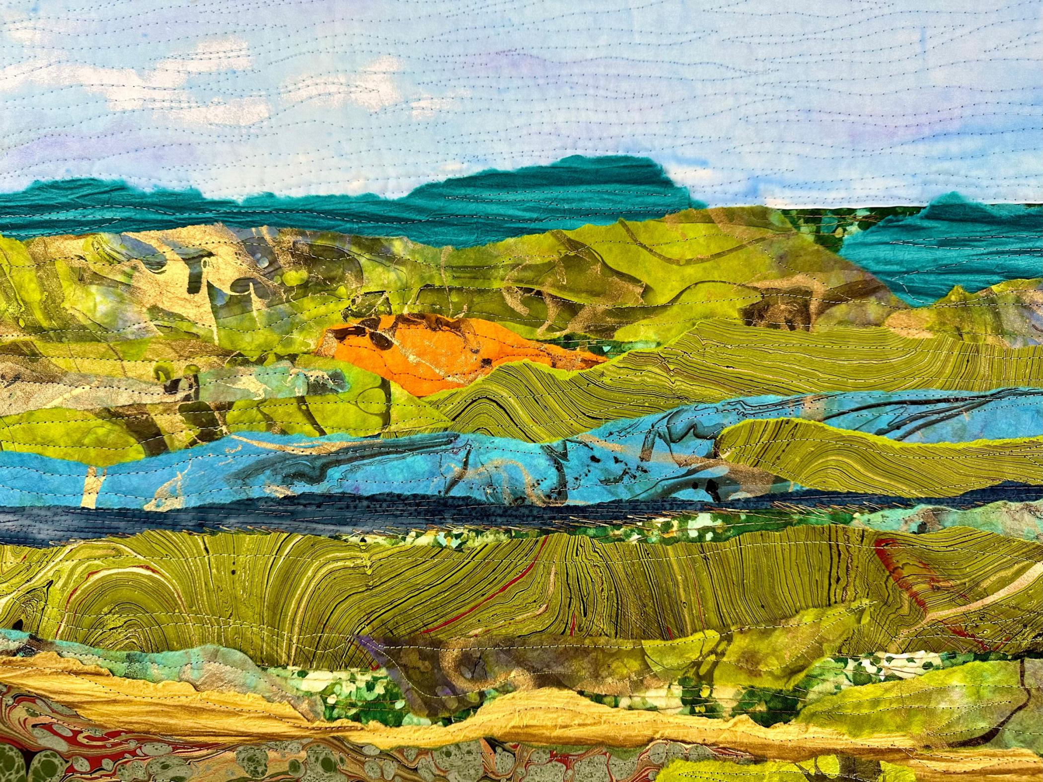 Handmade papers, cotton, acrylic paint, wax pastel, colored pencil