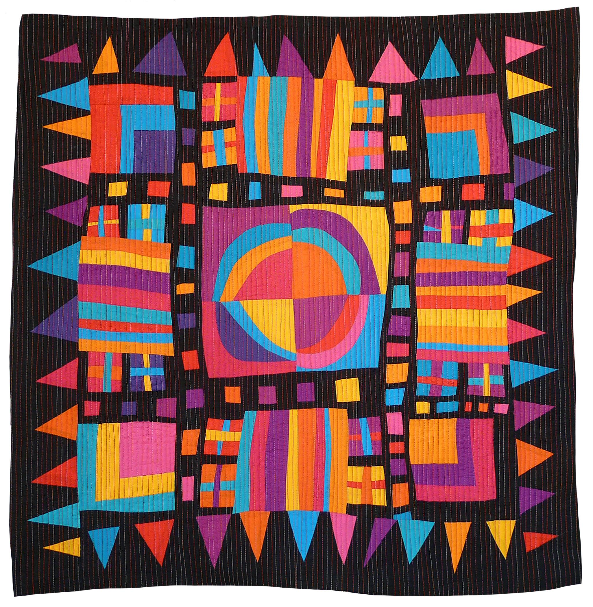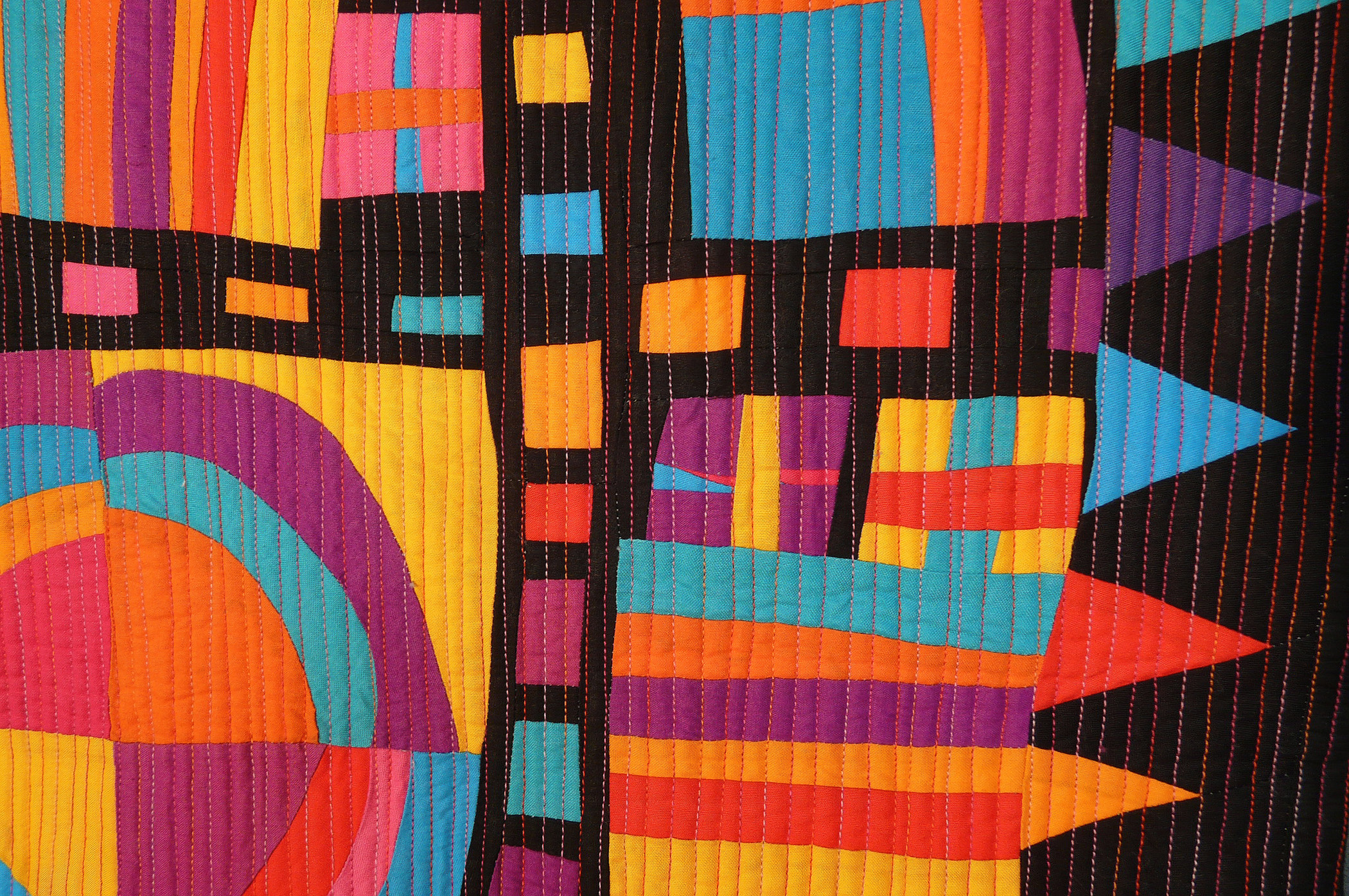 Good Day, Sunshine! was started as part of a group challenge during covid restrictions. Each month, for six months, the group was given a clue to interpret: curves, strips/stripes, squares/rectangles, + or x, and triangles. The last clue was to connect it all together. The piece is deliberately wonky, joyous, and hopeful. A ray of sunshine during what were dark times.