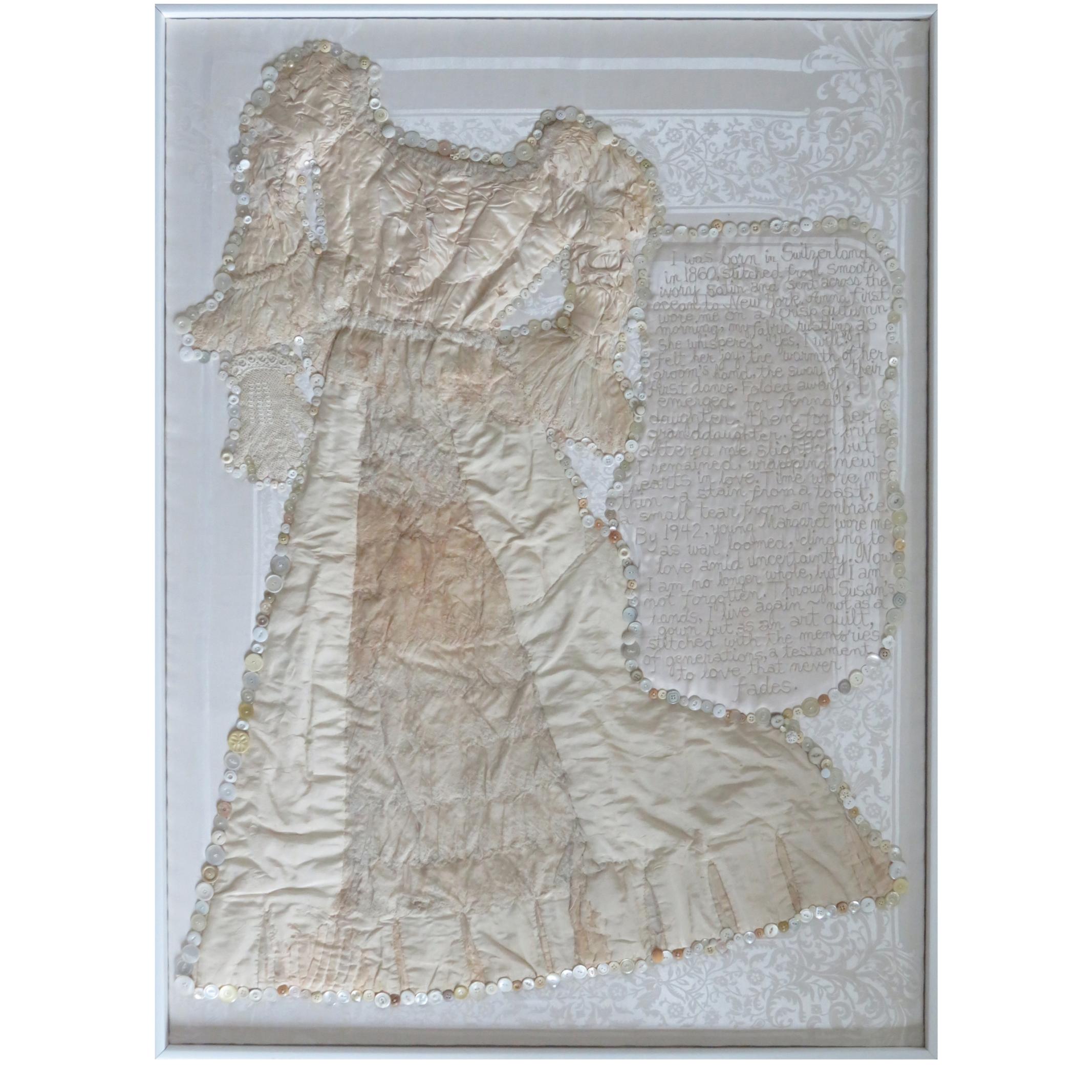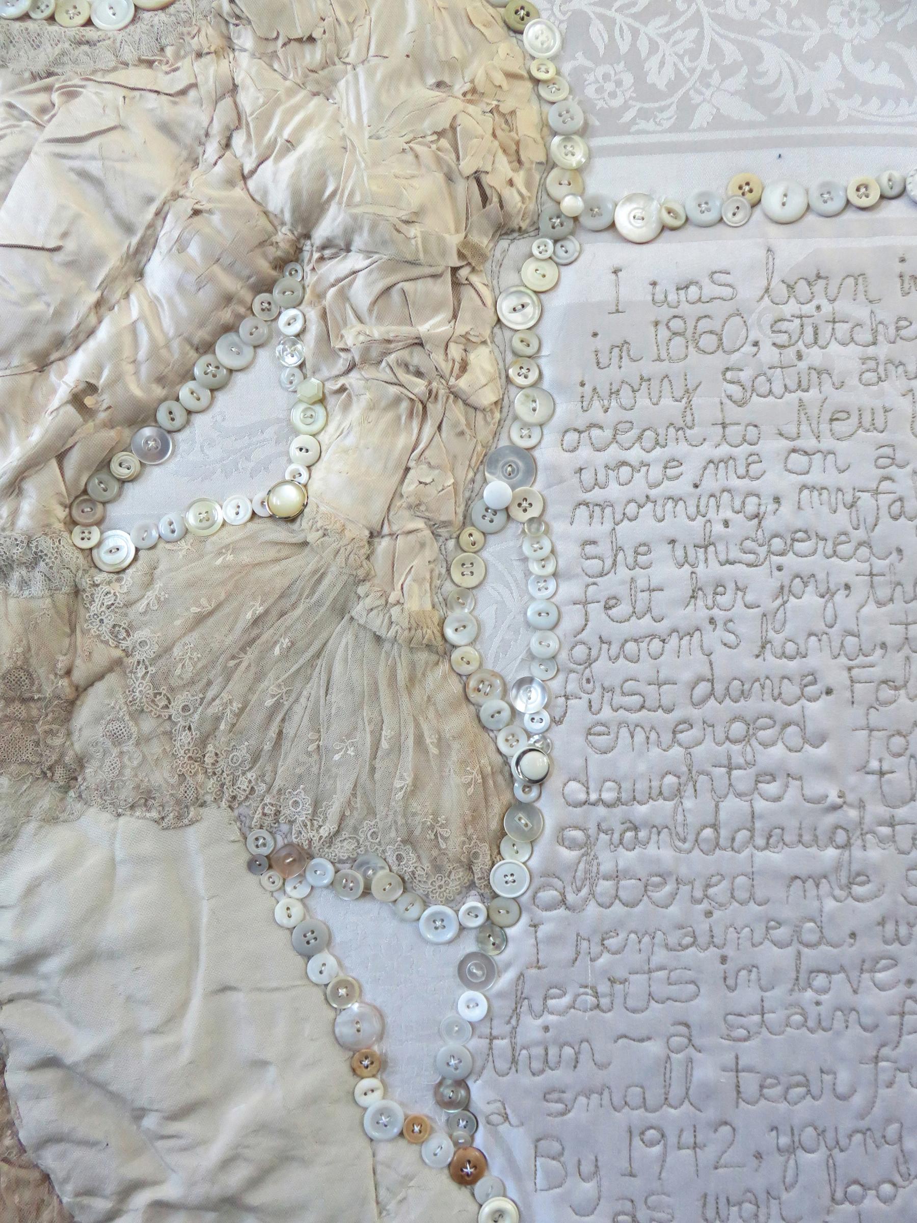 Antique 1860s wedding gown, bridal tulle, assorted buttons, vintage damask tablecloth, acid-free foam-centered board, thread