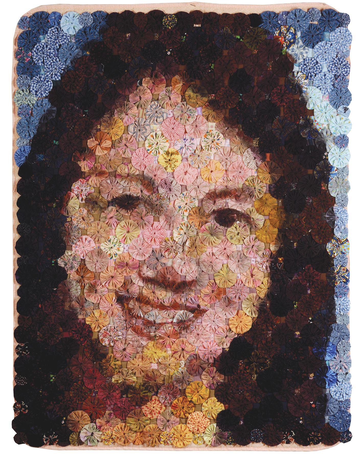 Yo-yos are rosettes created by sewing the edges of a circular piece of cloth and gathering it at the center. These became the building blocks I used to create a portrait of my daughter, Grace. Her baby blanket formed the base, and the yo-yos were made from her recycled clothing.