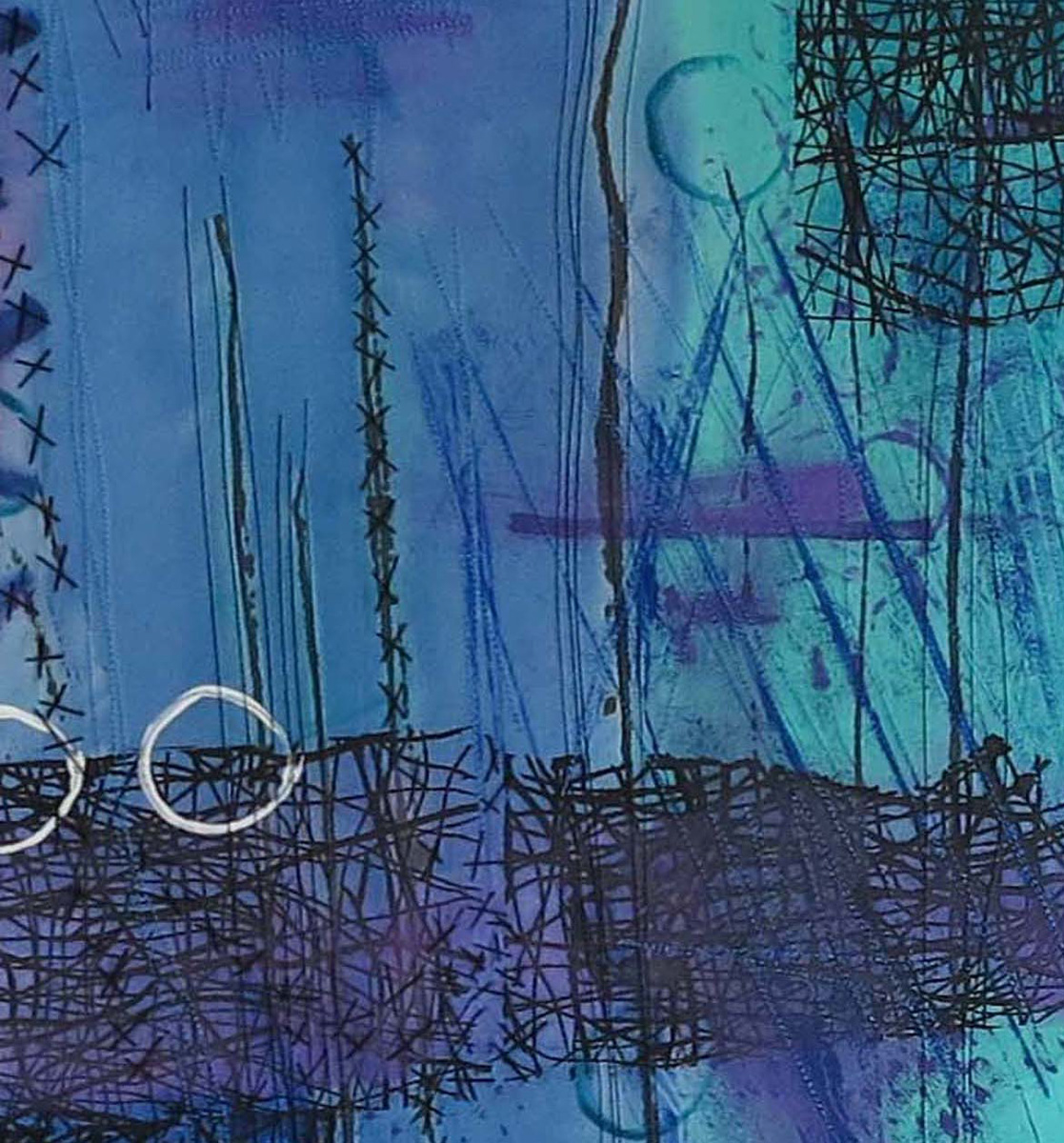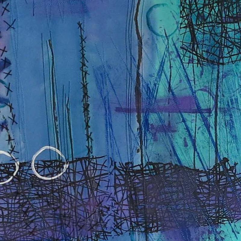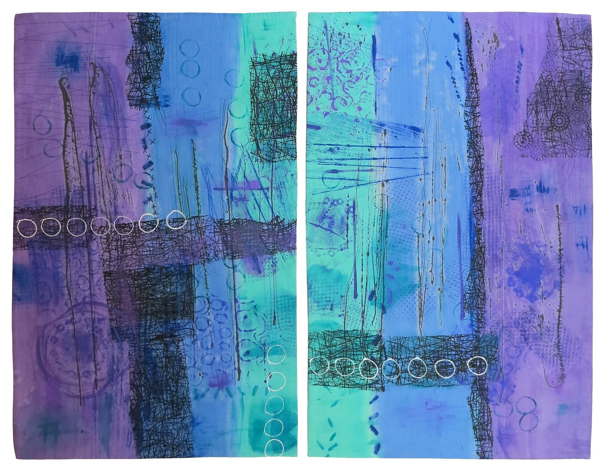 I love the serendipity of the paint as it hits the fabric. The contrast of colors excites me. Painting with thickened dyes for the background, I painted, stenciled and printed to create the graffiti like images. My intention is to provide the viewer with a sense of marks upon a wall.
