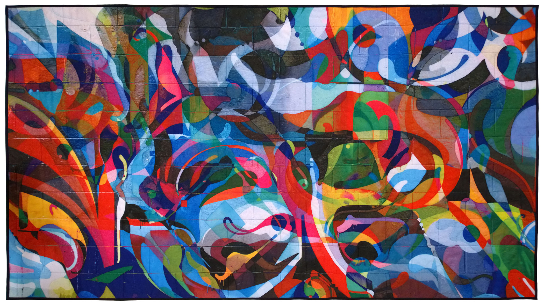 Digitally printed polyester whole cloth top, polyester batting, cotton canvas back, cotton thread.