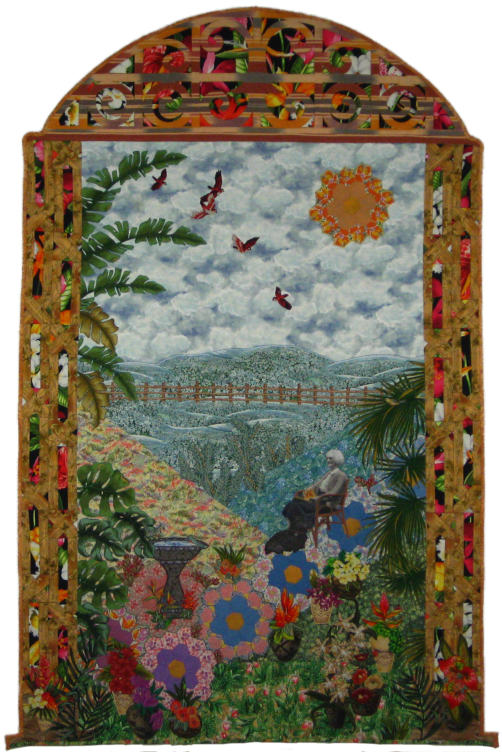 Grandmother's Garden, 3rd and final in the Redlands Rapture Series, was inspired by 1930's Grandmother's Flower Garden blocks from my stash and a photo of my grandmother, Edna Ricker. My original design features fussy cut fused raw edge applique elements edged with satin stitching and a pieced trellis created using the Garden Maze block. The domed top, crafted using reverse applique, was discovered in the local newspaper advertising gardening supplies. I projected an enlarged image onto the wall, drawing over the lines for a template. This is when I discovered the hand drawn original was unevenly lopsided! Carefully re-drawing the dome ensured balanced symmetry.