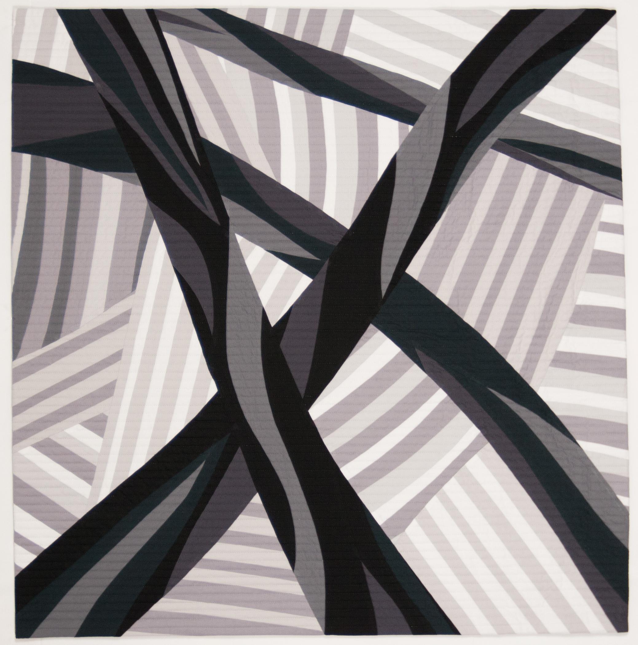 This is an early study where I explored how two distinctly different piecing methods (strip pieced background panels and curved improvisational shapes in the figures) could be combined to create texture and depth in the same composition. This was the first composition that allowed me to see each striped panel as one overall value instead of focusing on each individual stripe. The explorations continue with each new piece.
