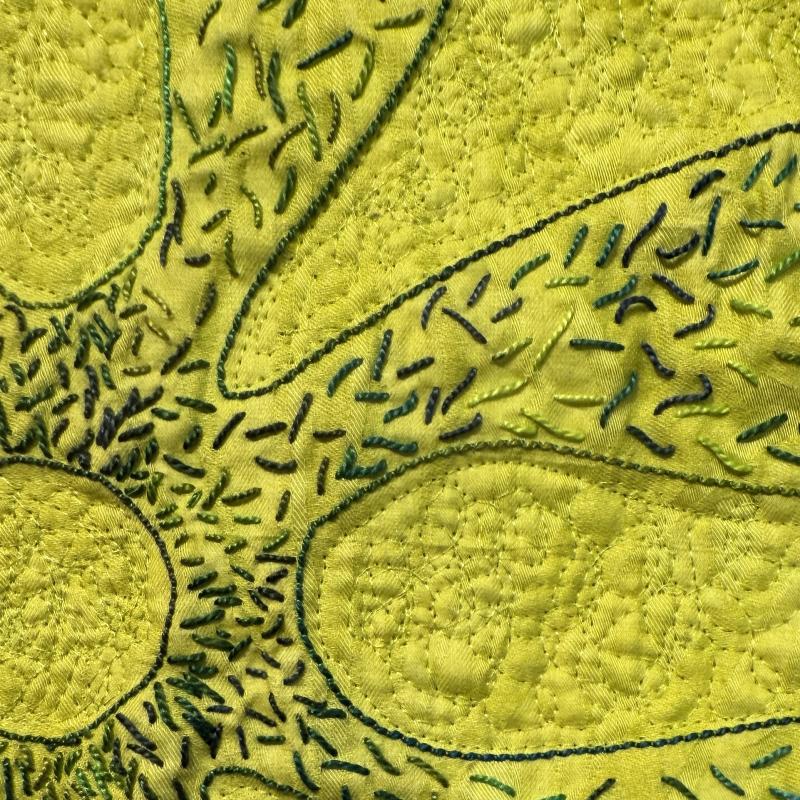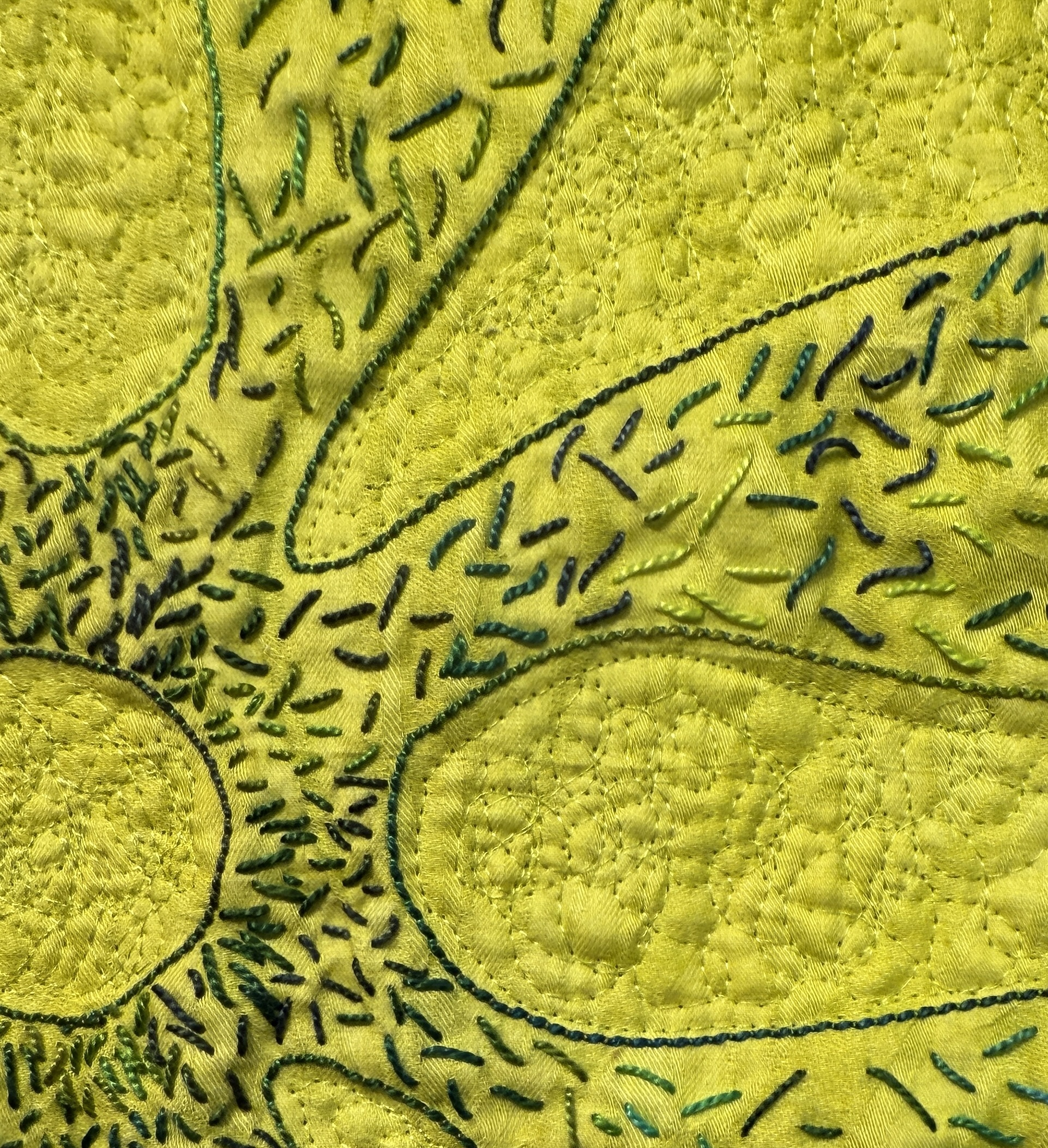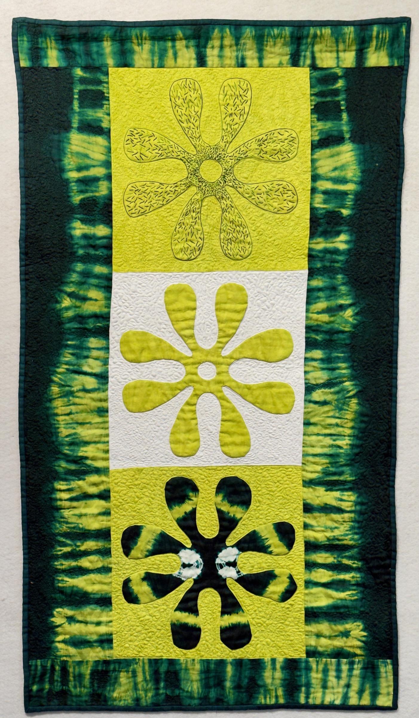 Greening is a cultural mash-up. It starts with a 19th century American quilt block design that I hand appliquéd using West African cotton brocade and batik fabrics, moves on to hand embroidery with variegated pearl cotton, and ends with free motion machine quilting. The common elements are the colors: green, green, and green!