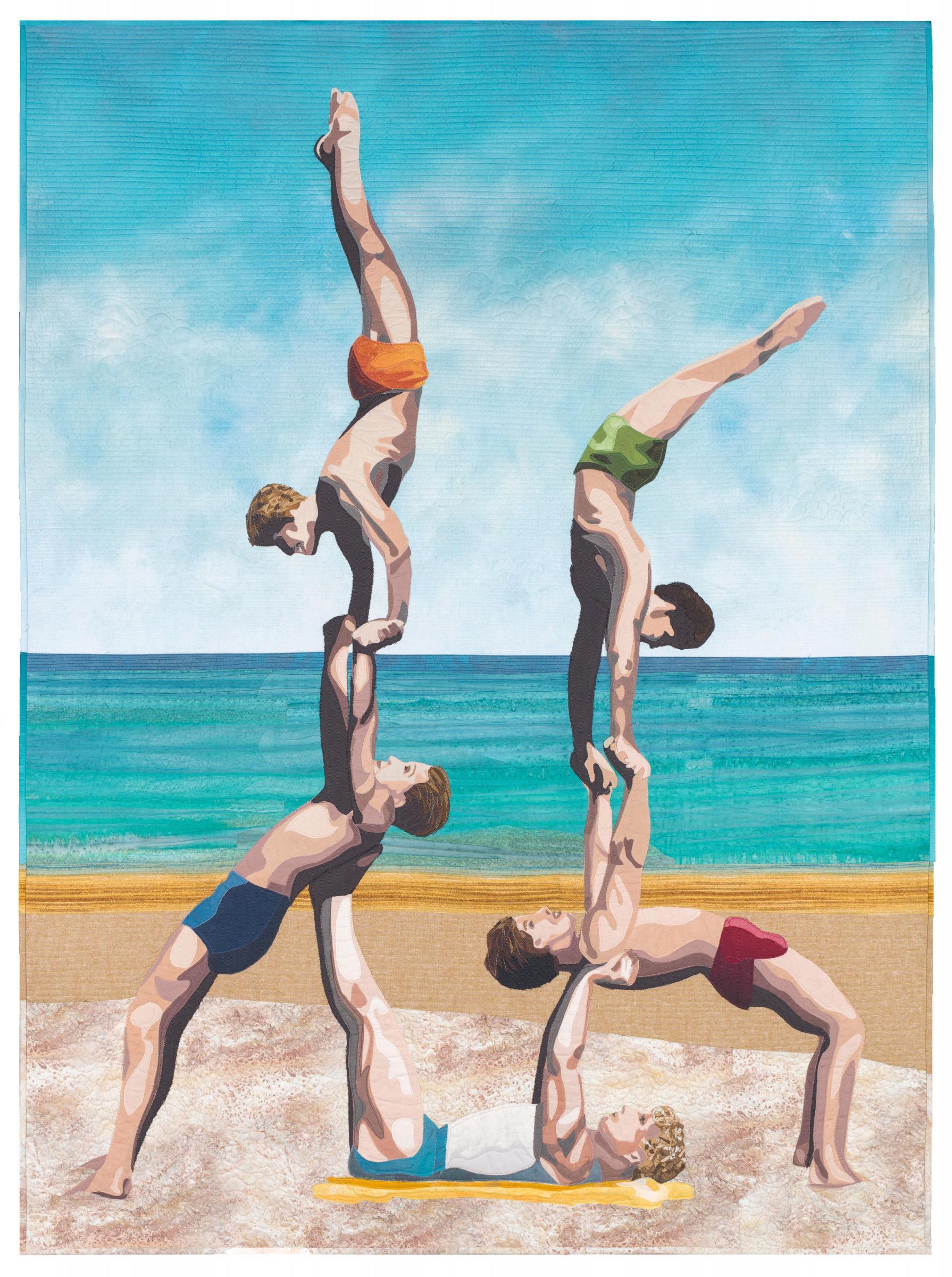 In the 1930s and 40s gymnasts would train and play together by gathering on public beaches. Building a human pyramid was a common way of playing with the balance and strength they had been perfecting. The body language explored in this piece is about the joy of play.
