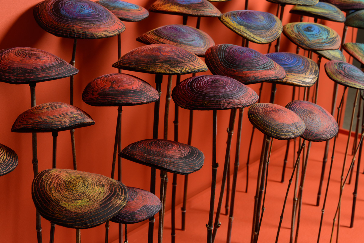 Black Thai silk, acrylic paint, batting, machine sewing thread, watercolor paper, bamboo stems