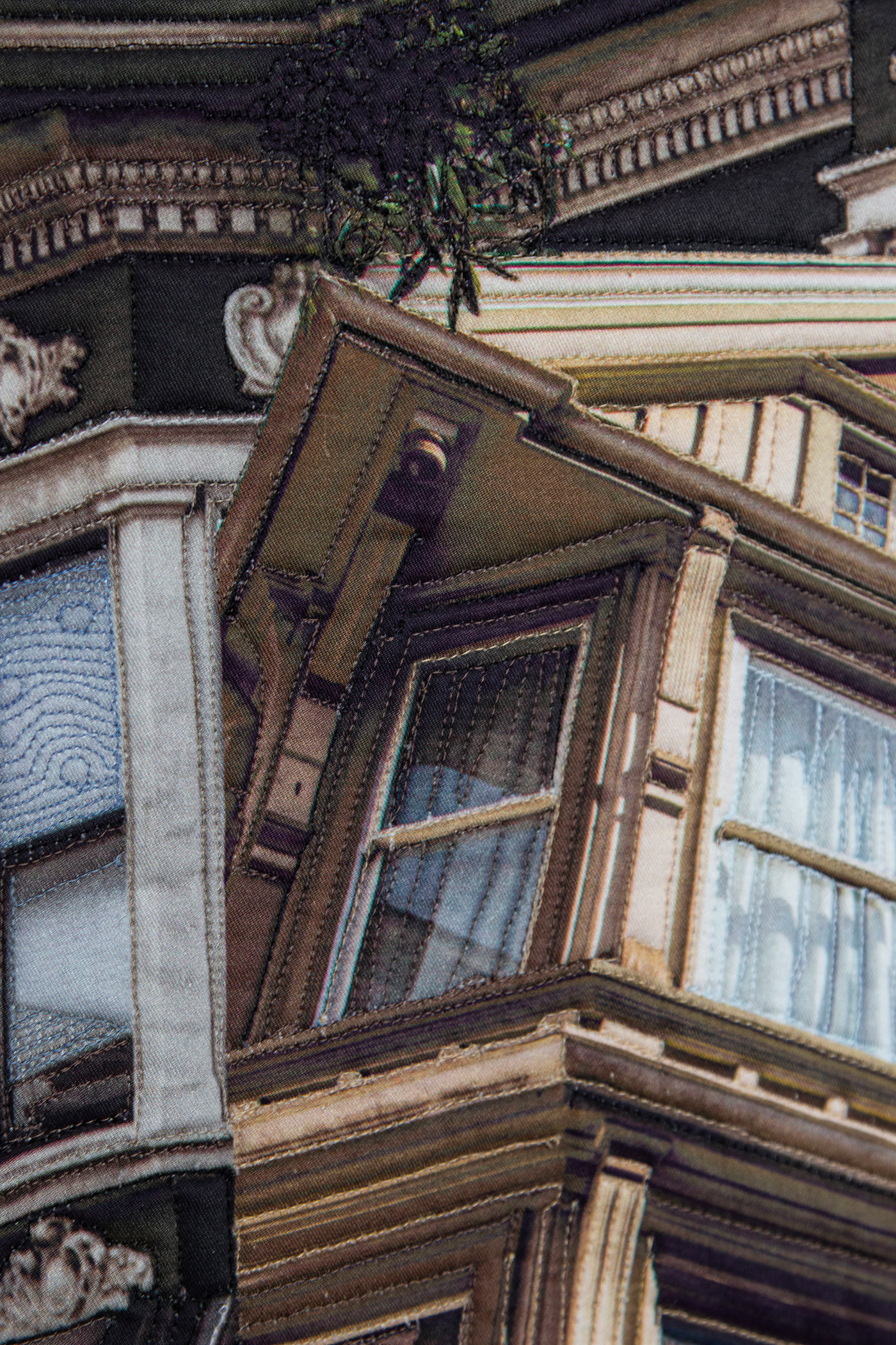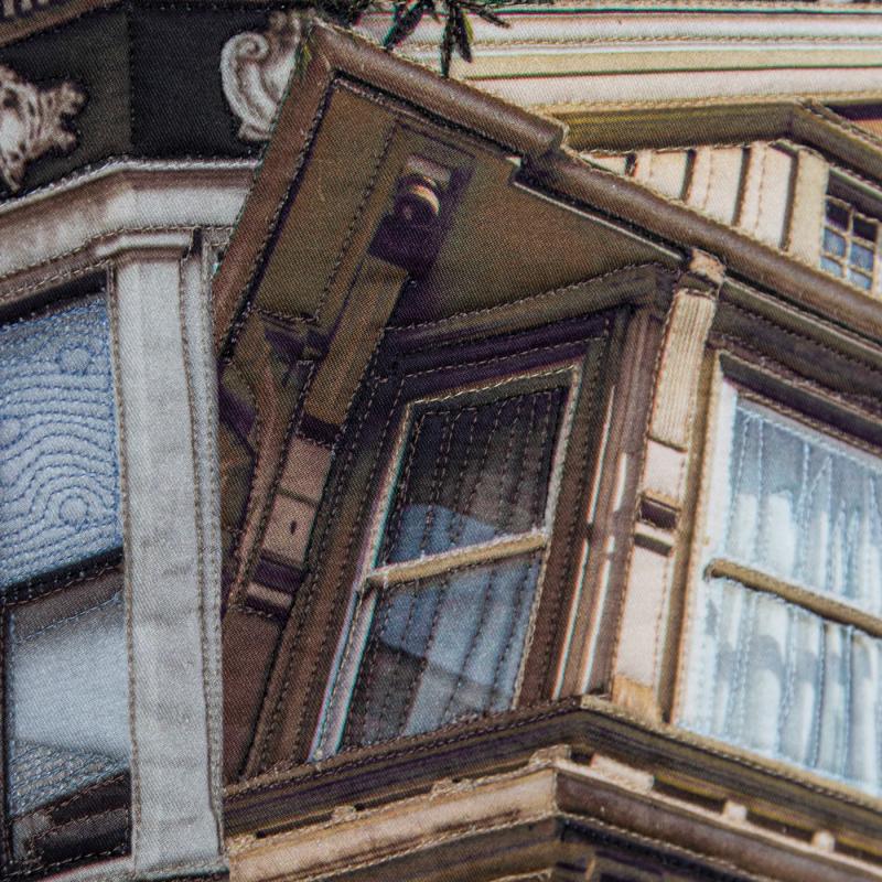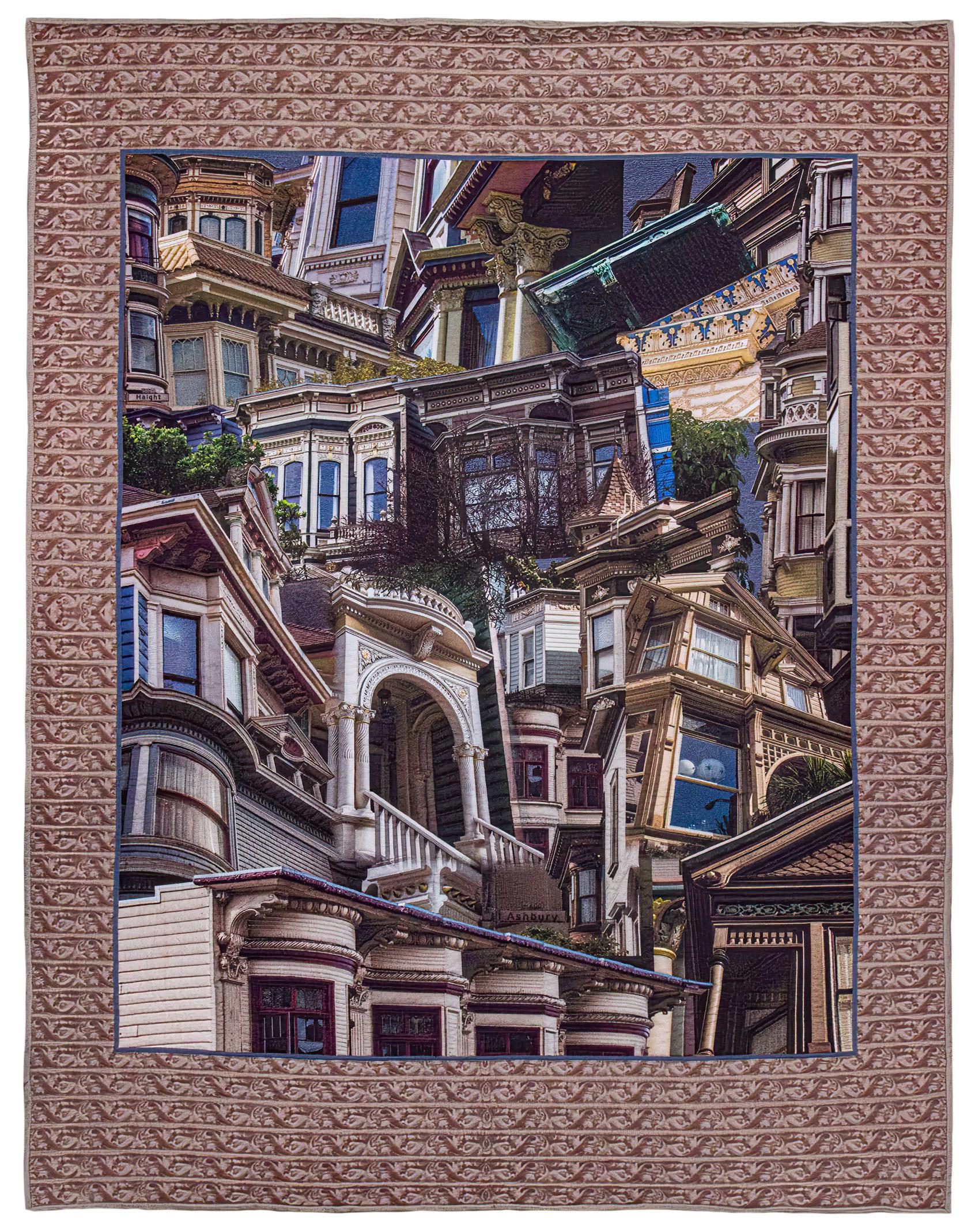 Haight Ashbury is an original design created from my photographs of vernacular architecture in the neighborhood of that name in San Francisco. This five-block neighborhood has one of the highest concentrations of well-preserved Victorian homes in the city and the quilt marks a memorable October morning.