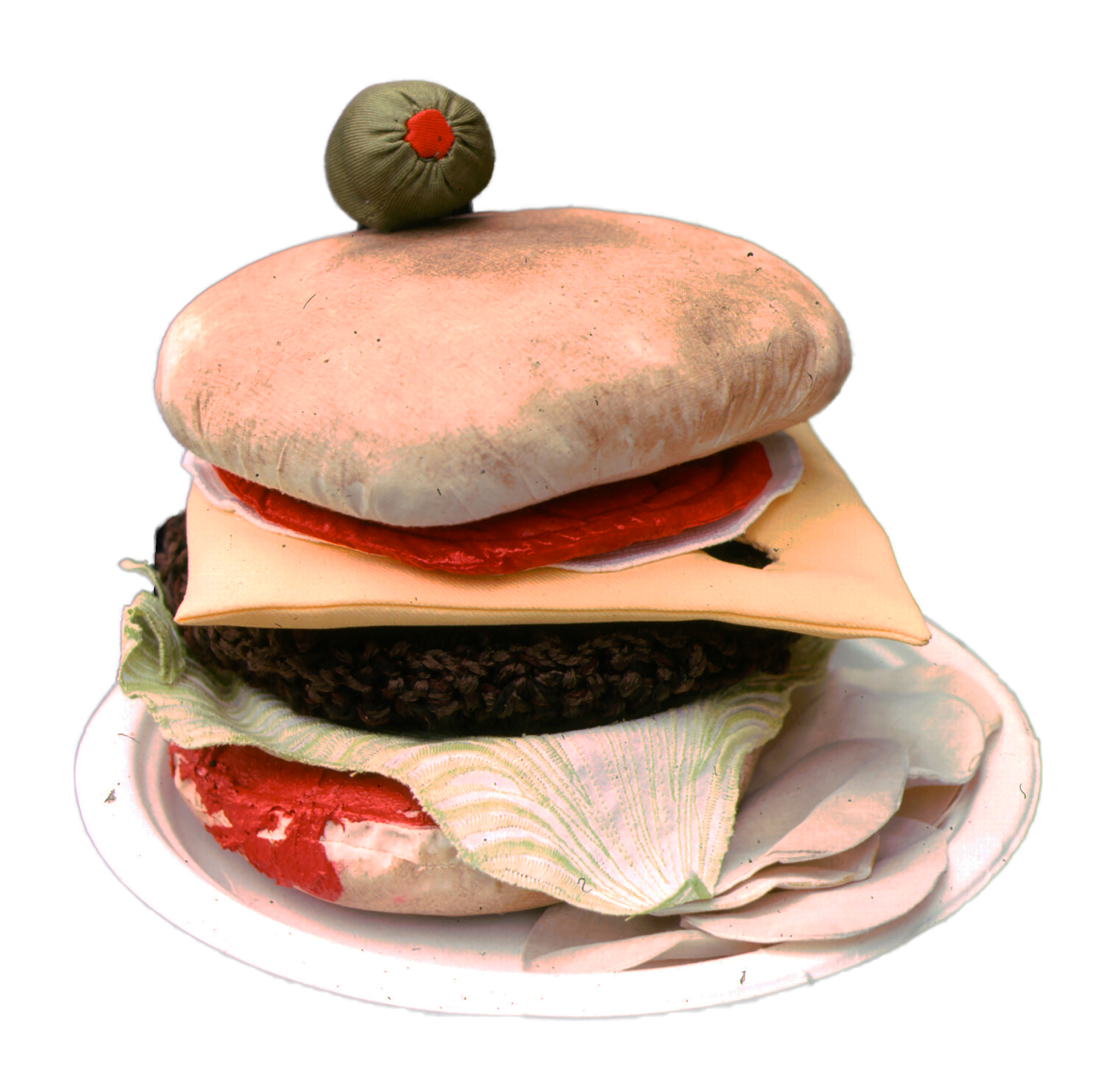 During the 80's I taught several classes at the Smithsonian. One class was Soft Sculpture probably made popular at the time because of Claes Oldenberg's work. I created the hamburger as a kind of sampler for the class. Each layer of the hamburger was a different technique. A stuffed and painted bun, with the bottom half painted with red paint (ketchup), the tomato stuffed and quilted, the slice of onion was severa layers of white organza stiched in circles, The Swiss cheese slice again was quited with holes. The actual hamburger was brown fabric stuffed then covered with brown yarn crochet. Lettuce leaf was several layers of organza stretched as it was stitched with various greens so it ruffled. The potato chips were a couple of different colors of organza stretched as they were stitched, turned inside out and pressed. The olive was another stitched and stuffed shape. I don't remember when it was sold but could have sold several more if I wanted to create more. I didn't.
