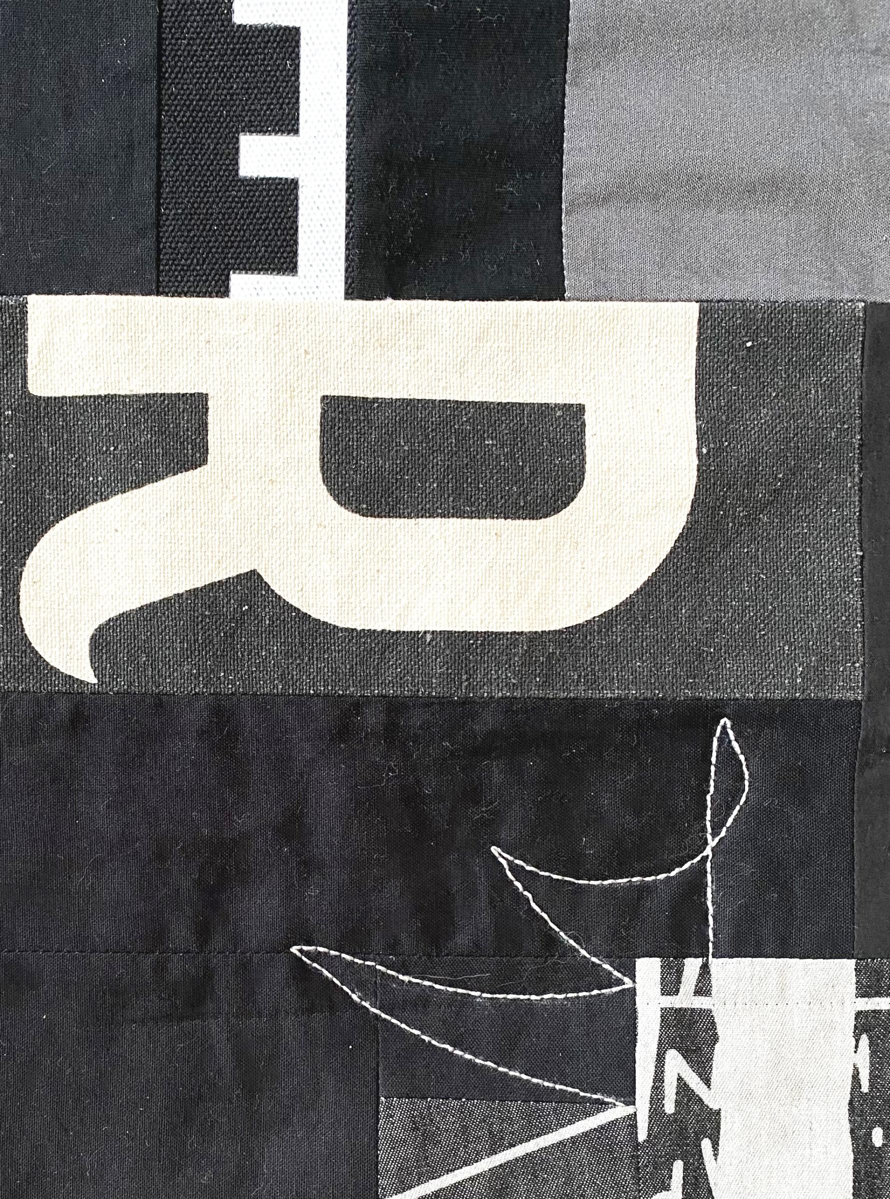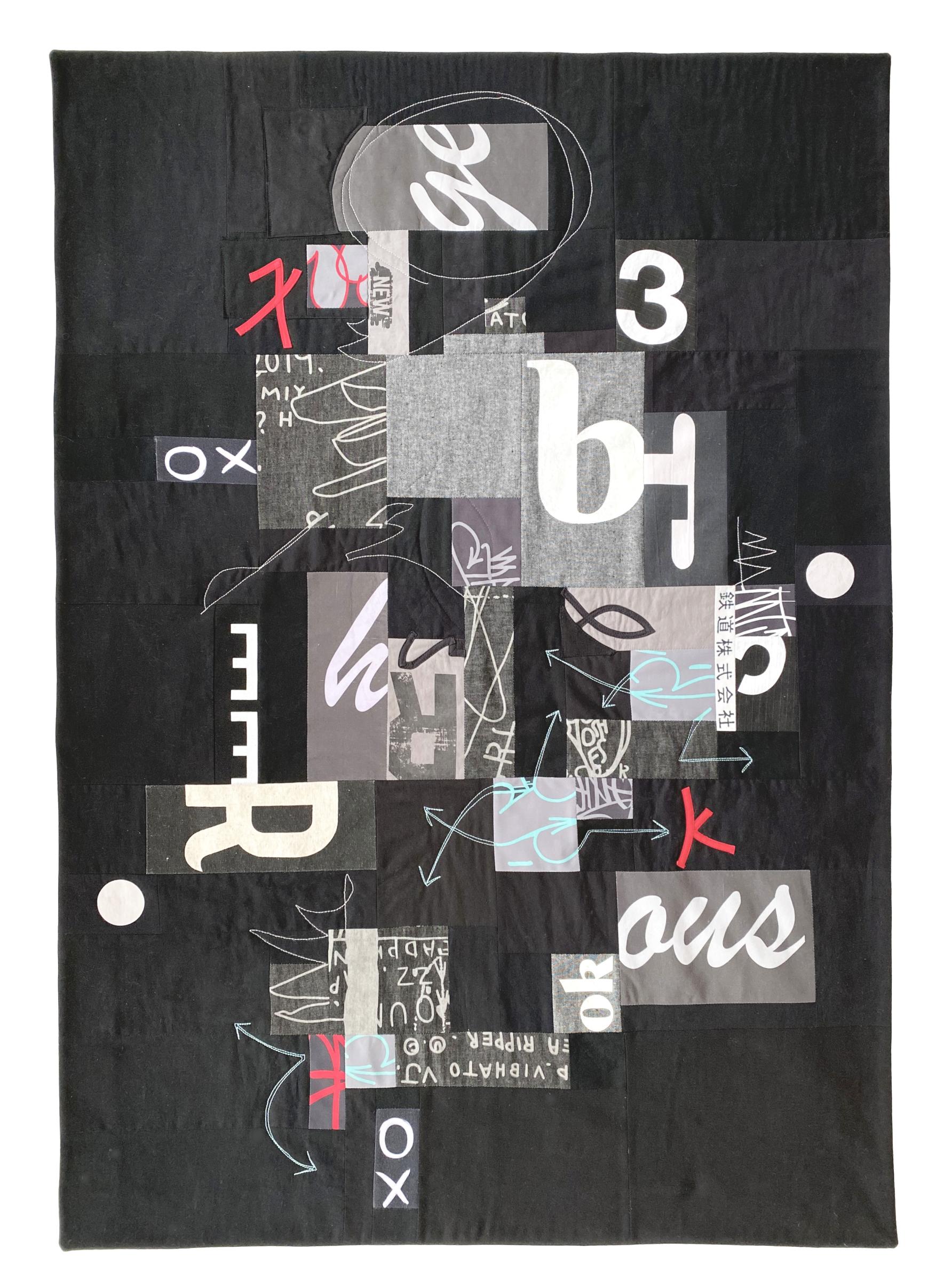Dyeing to Meet Digital explores the foundation of all digital computing, binary code, as both a visual language and an artistic symbol. Floating across the surface, the movement of strings of ones and zeros evokes the unseen logic driving AI, while the artwork is graced with uniform pixel-like blocks that represent the basic building units of digital imagery. Rather than mimicking the vast color spectrum of a machine, this whole cloth, hand-dyed piece reflects how a human might interpret AI's visual world—structured, symbolic, and layered with meaning. It offers a response to artificial intelligence, honoring its origins while reimagining its aesthetic through human eyes and hands.My art explores how we process the daily flood of visual information in our busy lives. I use discarded clothing and other reclaimed textiles, both for environmental reasons and because their patterns and marks are part of the data that we encounter and must make sense of every day. In Haphazard, I started with meaningful marks such as letters and arrows, just as generative AI relies on existing data. Dividing and recombining these marks in the quilt-making process allows me to observe how they both lose and gain meaning, exploring what a conscious human maker adds to artwork.