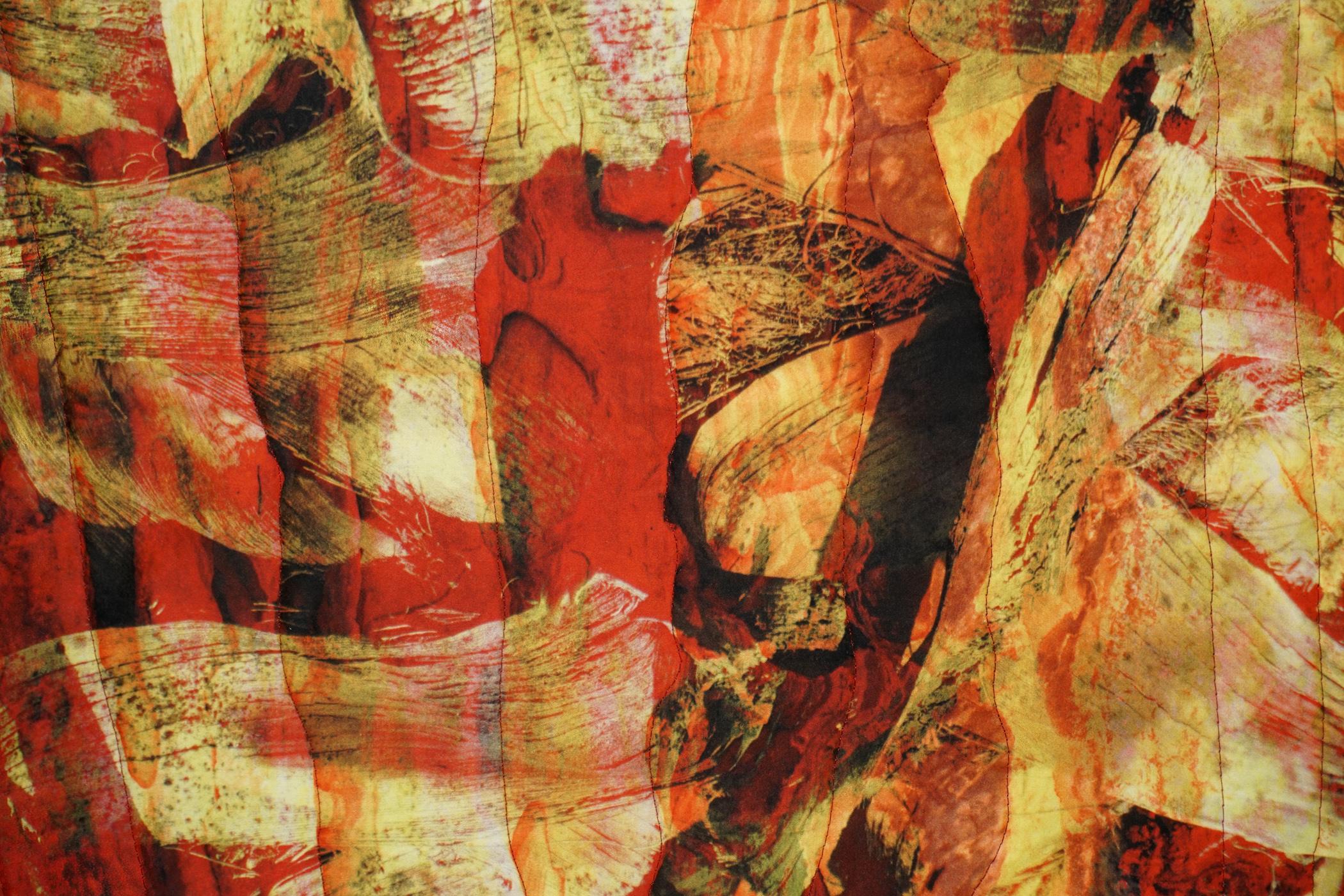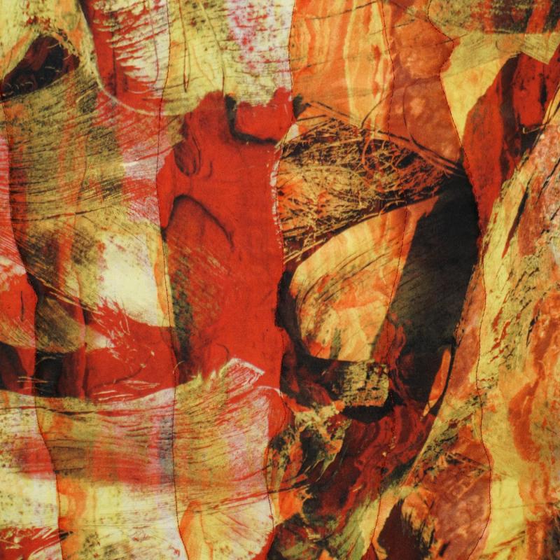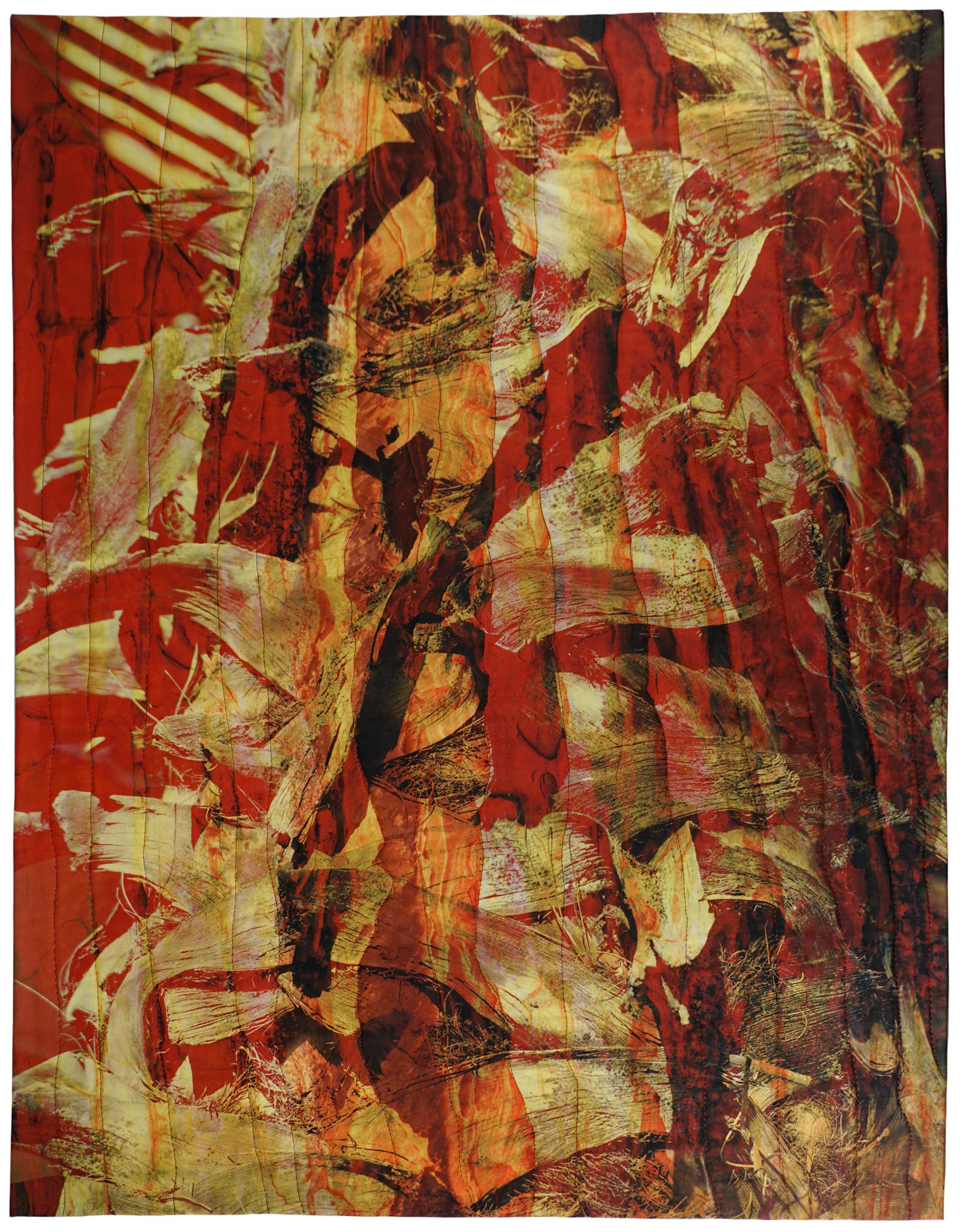 My photographs are the starting point of my work, but then, with the help of the computer, I manipulate, layer and rotate these images to reach the sweet spot between chaos and order in my design. Photographs of a palm tree bark and rocks are the basis of this composition. By superimposing them I defamiliarize each and create a new composition which allows the viewer to see the intricacies of nature’s designs.