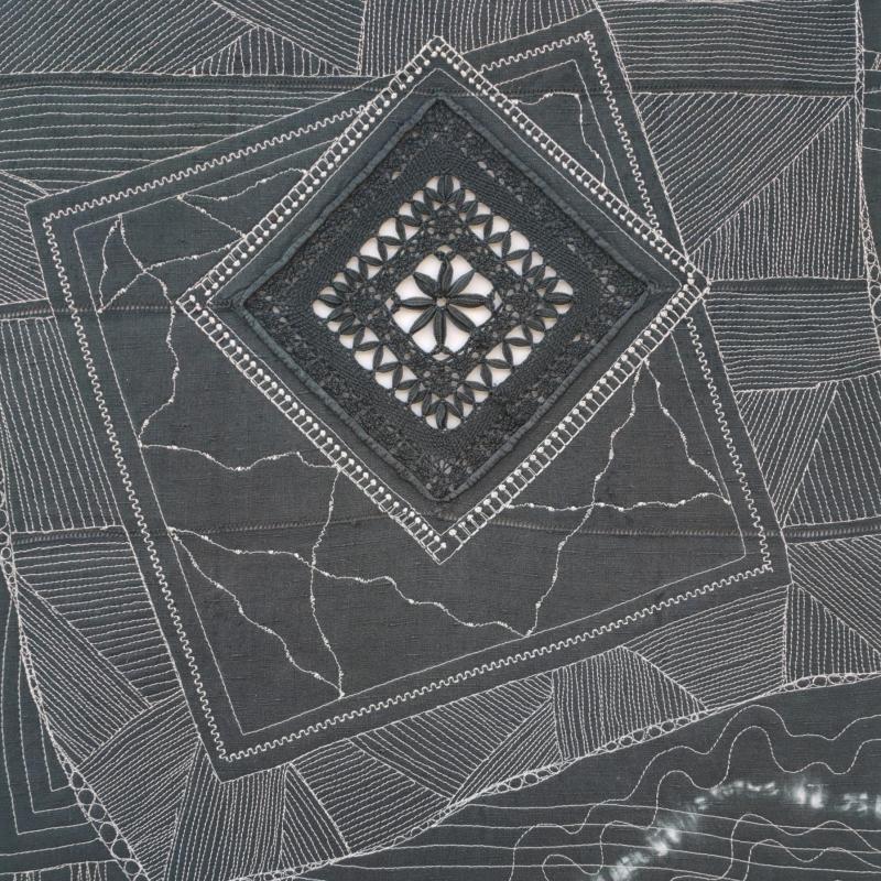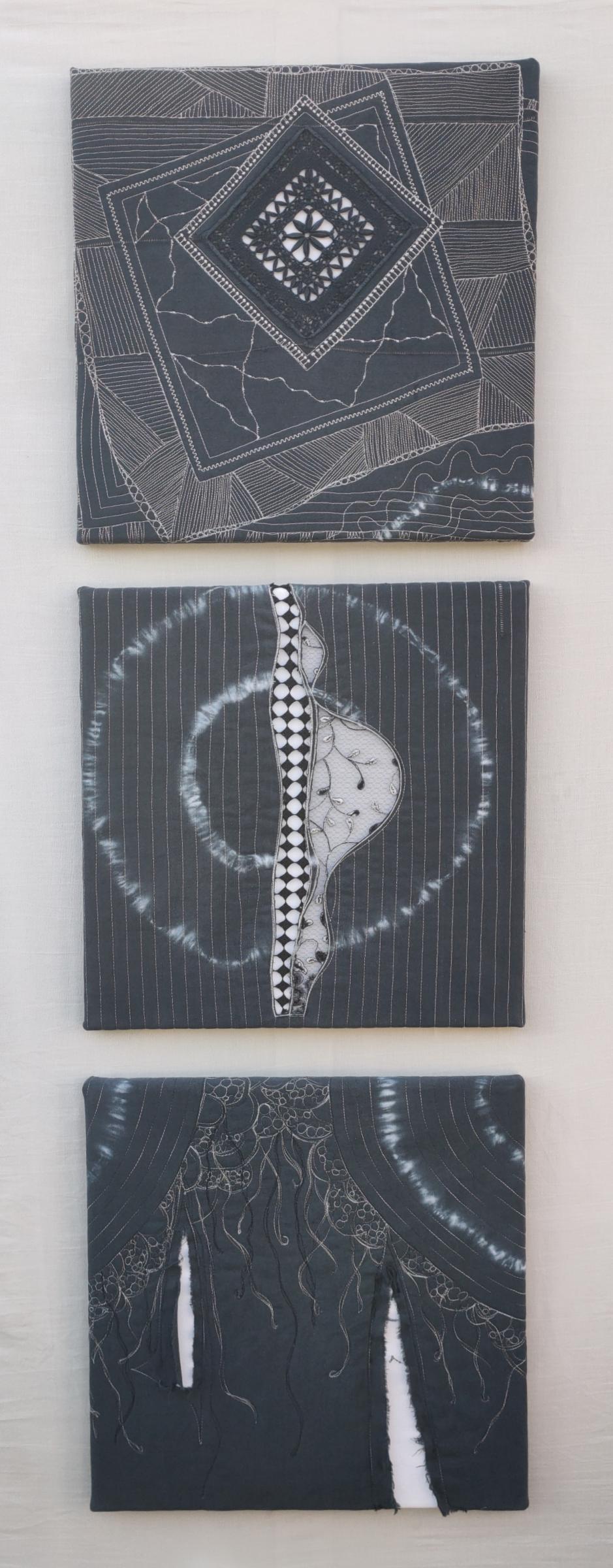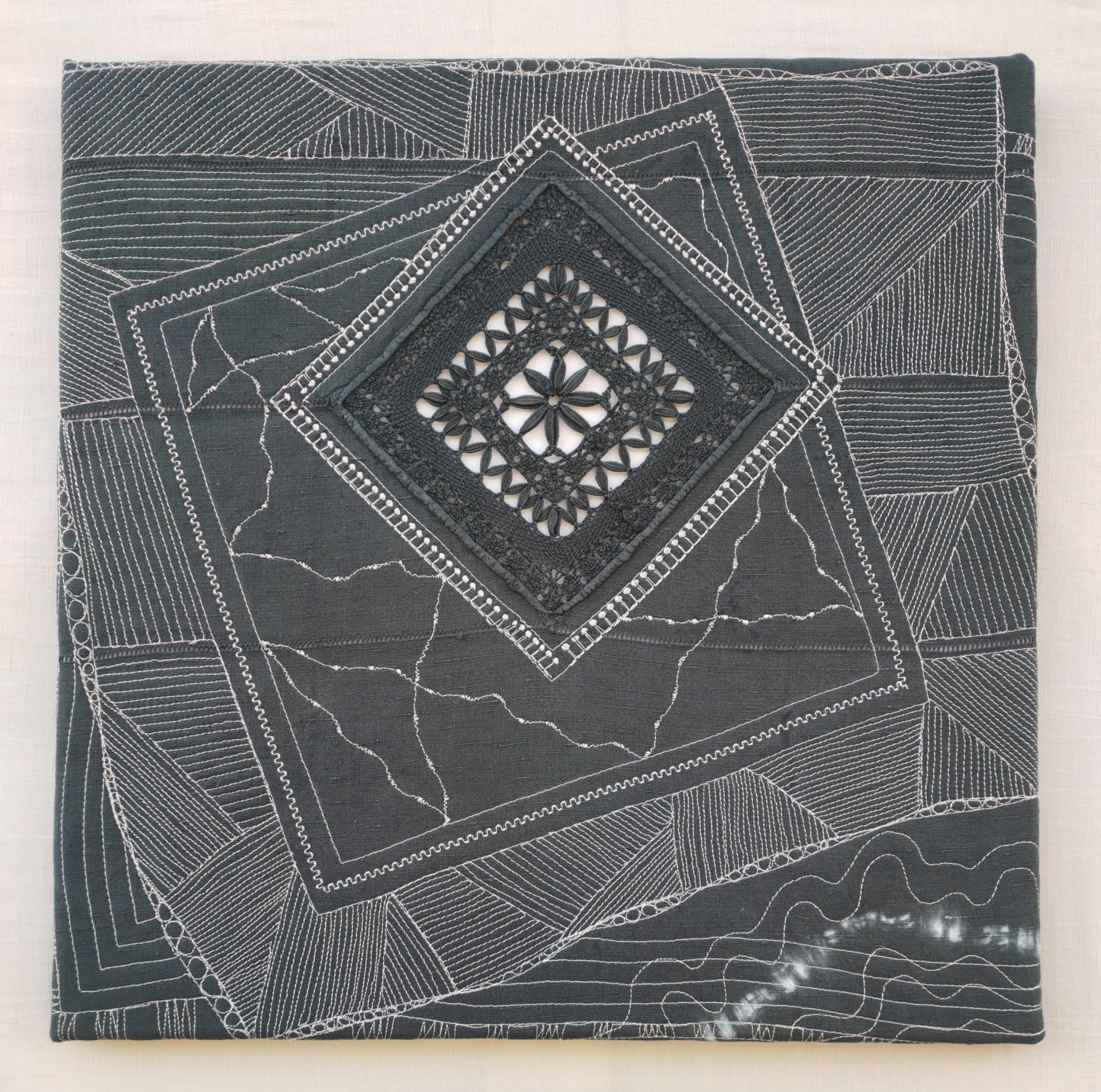 My mom's vintage, torn, stained bedsheet was tie-dyed black. Free-motion and dual feed quilting on a domestic machine. Mounted onto framed canvases.