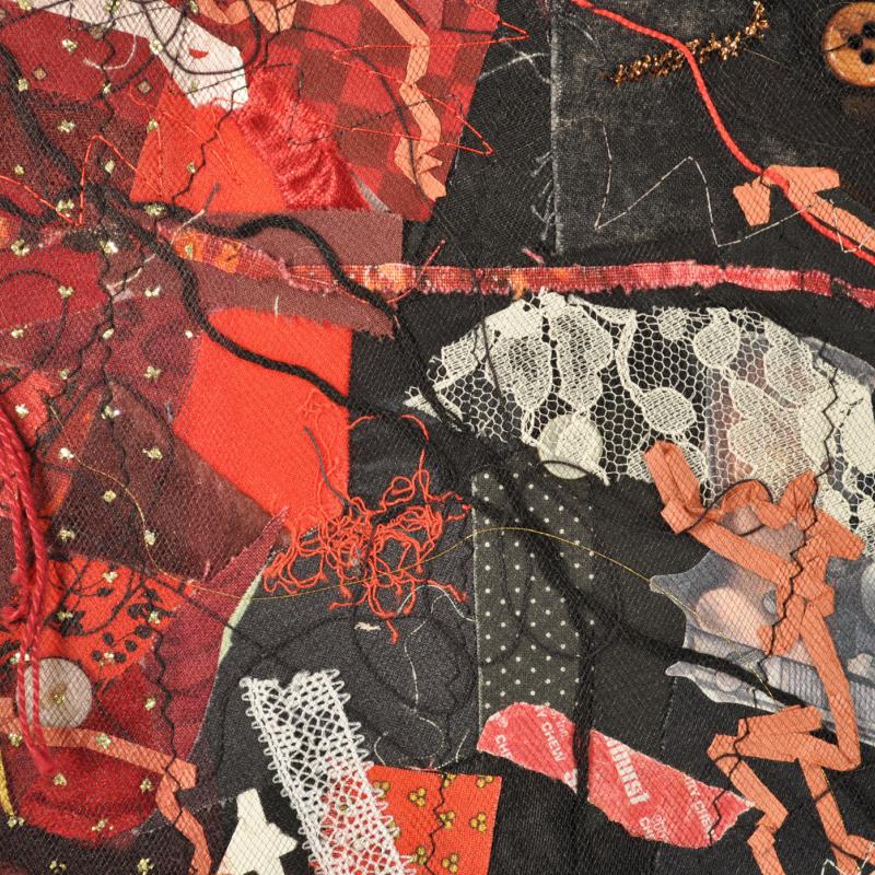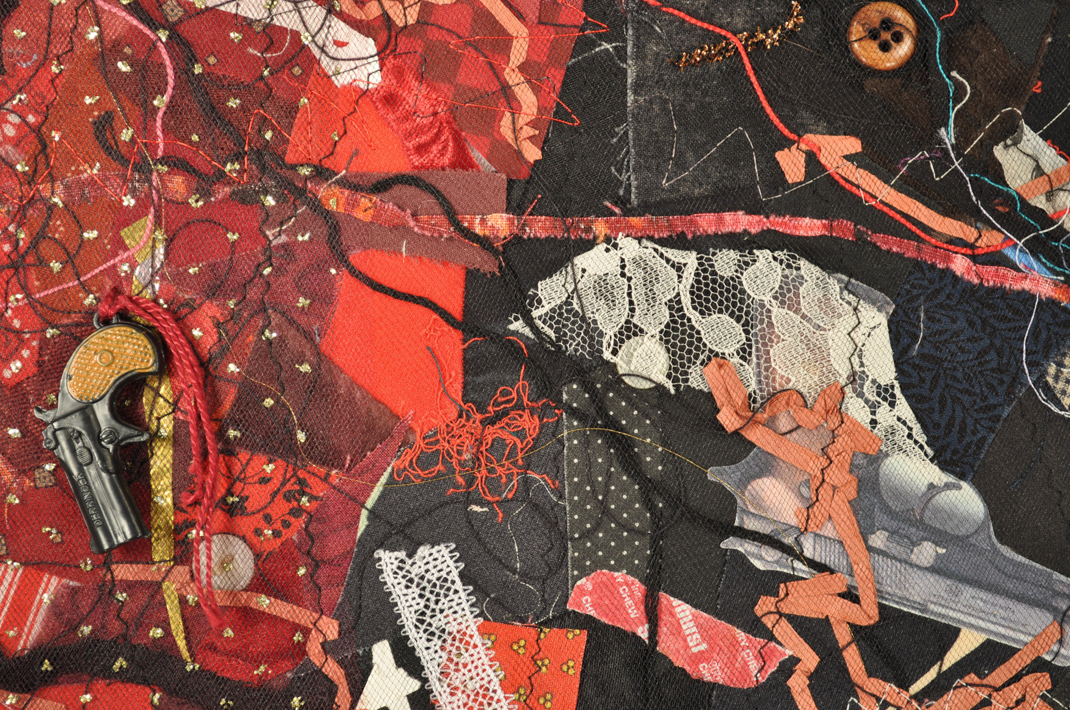 Fused fiber fragments, found objects, photo transfers, toy guns, silk ribbon, tulle