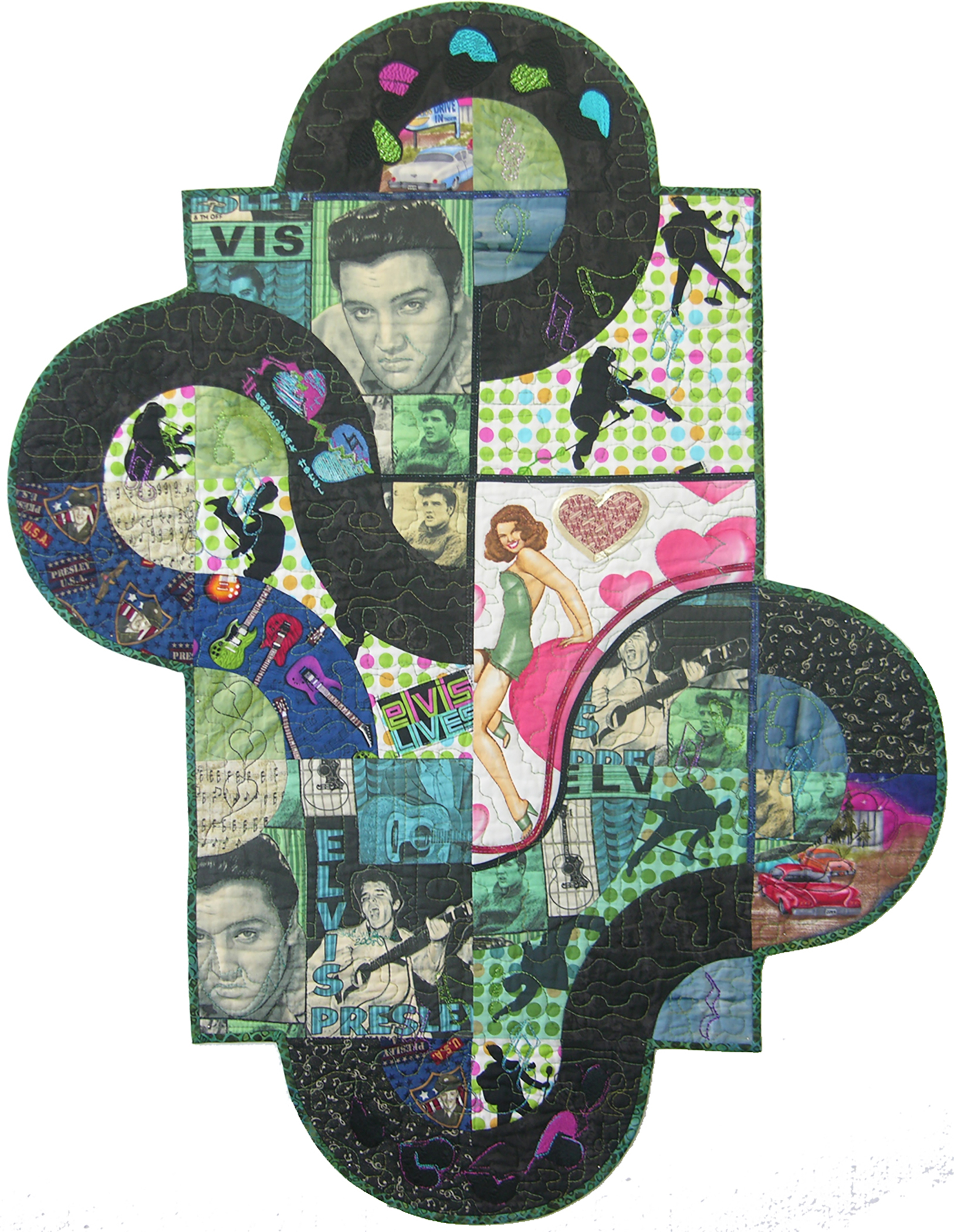 I went through the l950s and '60s with Elvis Presley; he was my first love. I still remember him singing "Heartbreak Hotel" on the Ed Sullivan show, the unforgettable time I when (with most of the country) first time I saw this singer perform. "Heartbreak Hotel" has always been my favorite of his songs and remains so until this day. This art quilt recounts icons associated with that era of this mesmerizing rock star's legendary life.