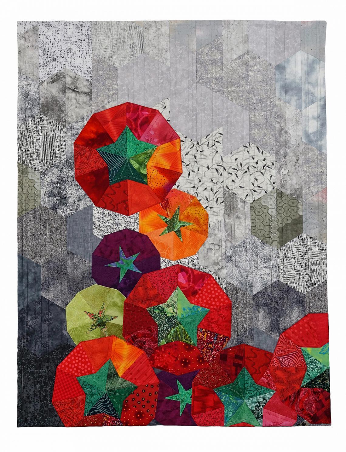 Browse the Collection Heirlooms Elaine Millar Size 40 in x 30 in (102 cm x 76 cm) Exhibition Food for Thought (SAQA Global Exhibition) Price $0.00 Buy Now >> In late summer, tomato crops peak. This quilt depicts the light that would come through the window and reflect on the granite counter top, which is covered with the tomato harvest.