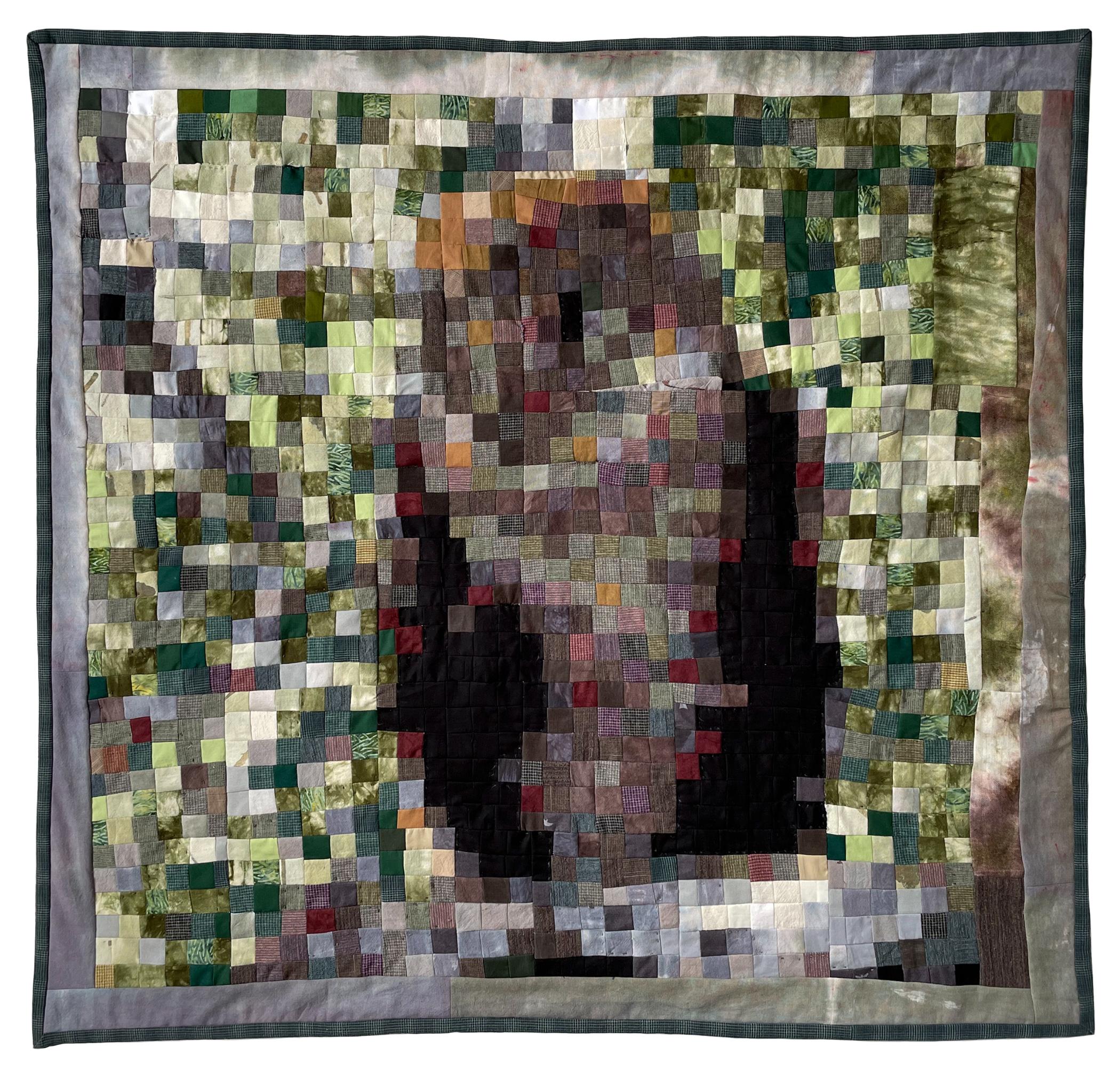 The barn owl quilt is thirty-six by thirty-six squares or “double life.” Even while remaining attentive to the details of the owl’s existence, the pixelation here suggests that one can perceive and perhaps appreciate the bird only from a distance—the animal’s existence is a predictor of ours. This nocturnal owl lives in my neighborhood and sleeps in a hollow palm or deep within a tree canopy.