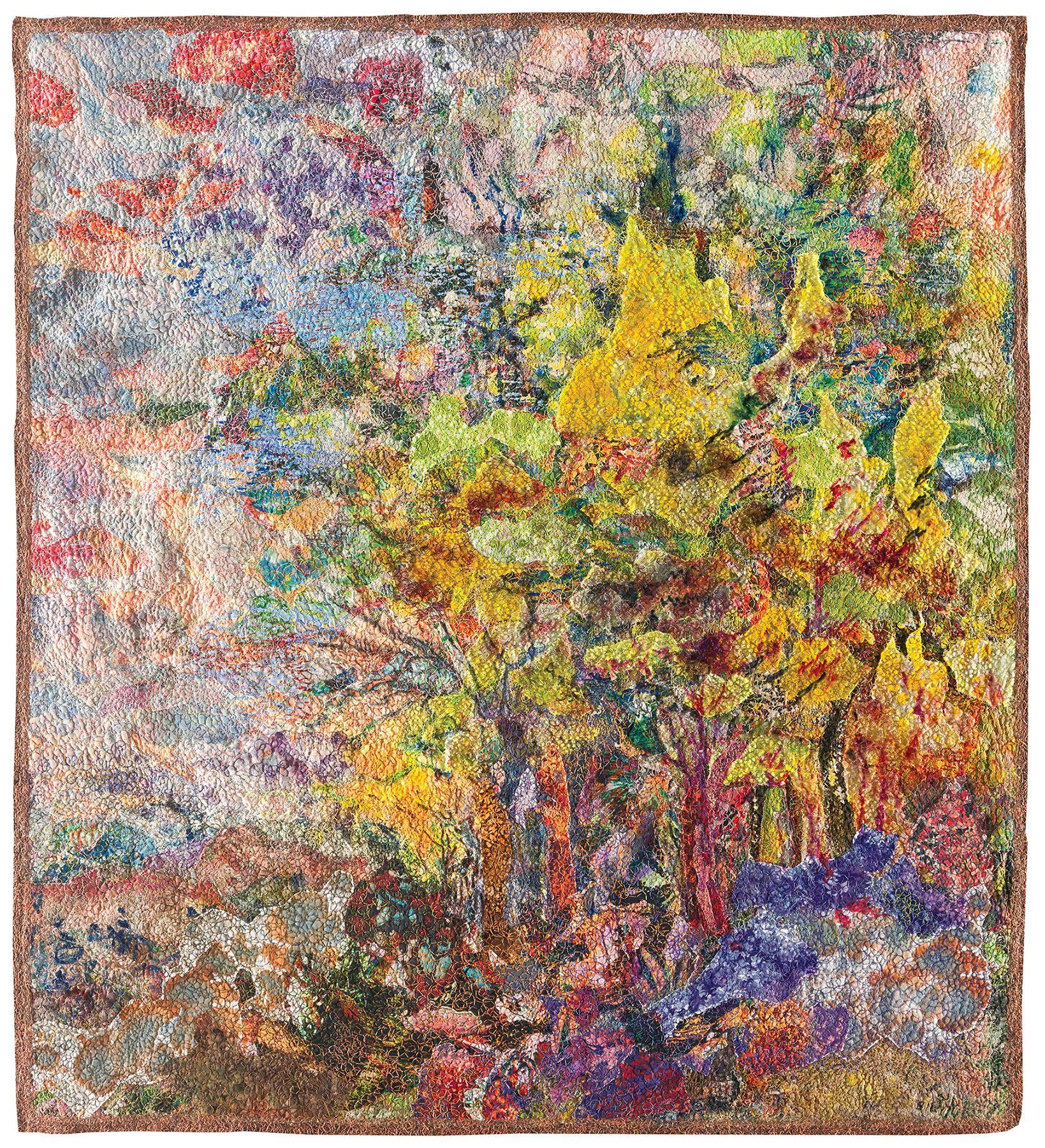 Raw edge appliquéd, free motion quilted, stenciled, painted