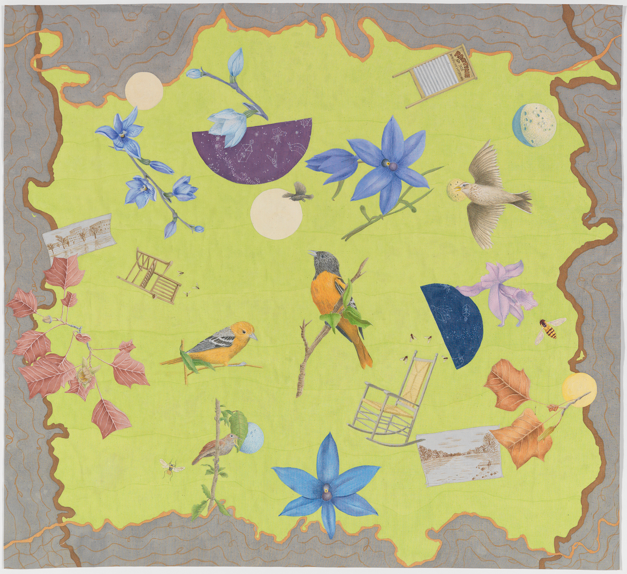 Two of my interests, music and nature, dovetail in this piece. Some of the songs that inspired images are "Baltimore Oriole", "Stardust", "Lazy River" and every song with the word "moon" in the title. The Wabash River, referred to by Indiana Native Hoagy Carmichael, provided the contours for the border area.