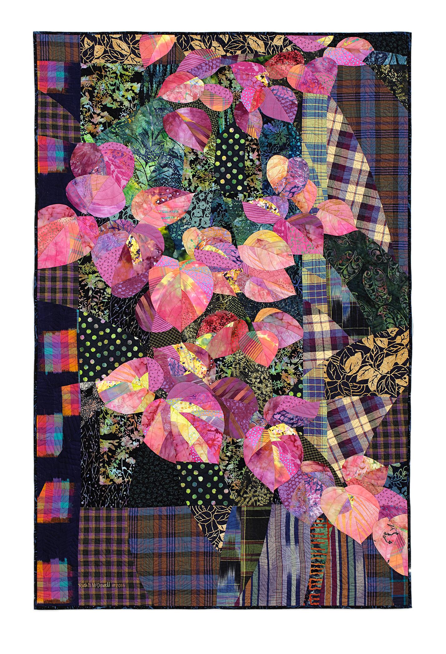 I once found a plant of our native hobblebush with fall leaves of salmon, raspberry, burgundy, and electric lemon yellow, and astounding combination. Usually they are just a soft clear yellow. This is not a combination of colors I normally use, but it was fun to try to capture it. As I've said before working out the background/borders is the most difficult part of a quilt like this. One has to complete and balance the composition and enhance the fabrics and colors you've already selected for the leaves. The large scale plaid at the right side was a surprise find. Hard to say why, but I think it works very well.