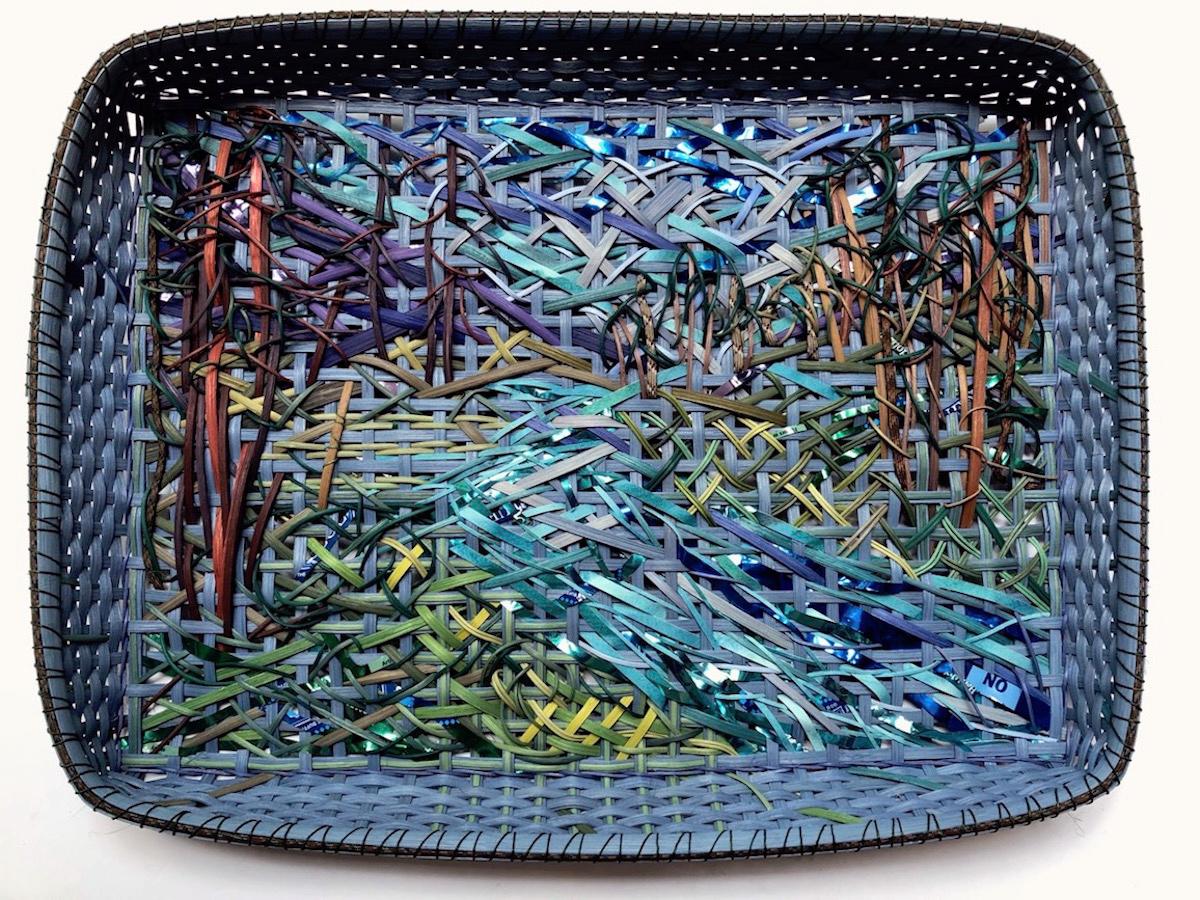 Dyed rattan, dyed bleached Hamburg cane, recycled cat food bags, paracord, twine, painted paper, plain and random woven, overlaid, v-stitched