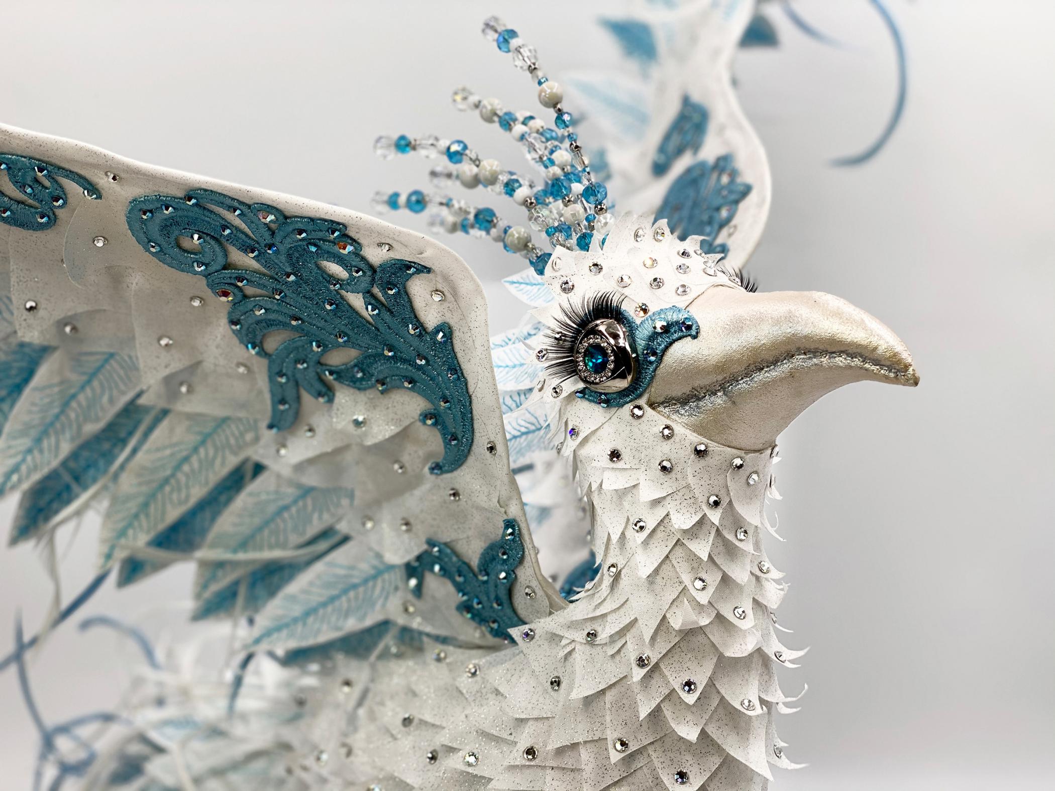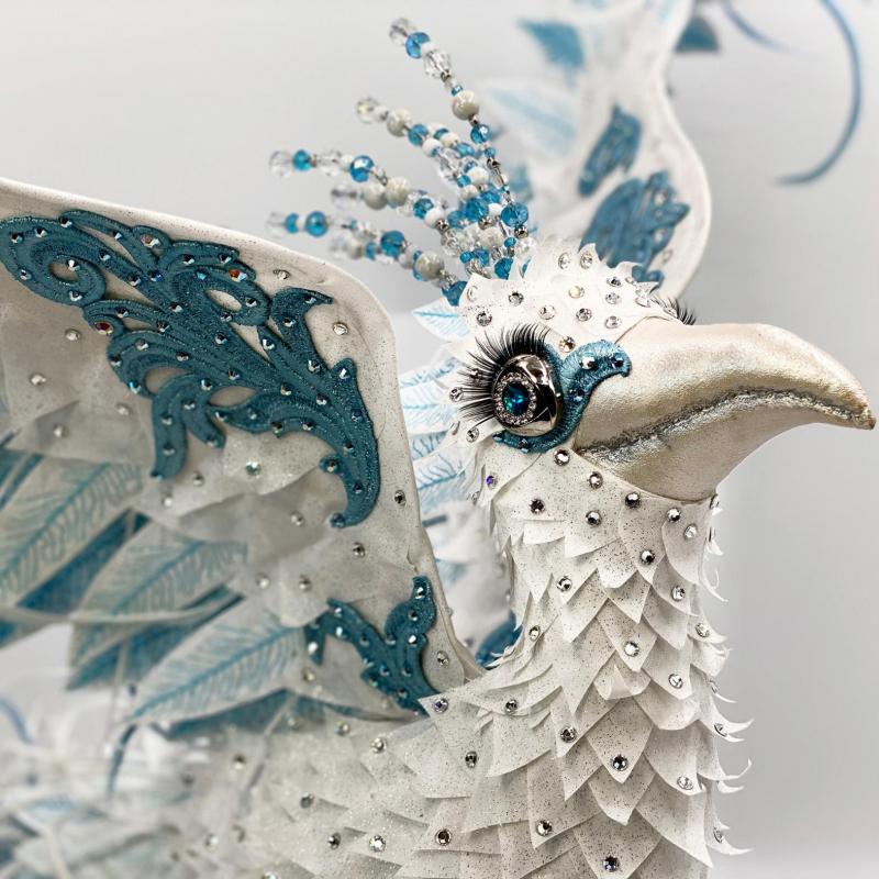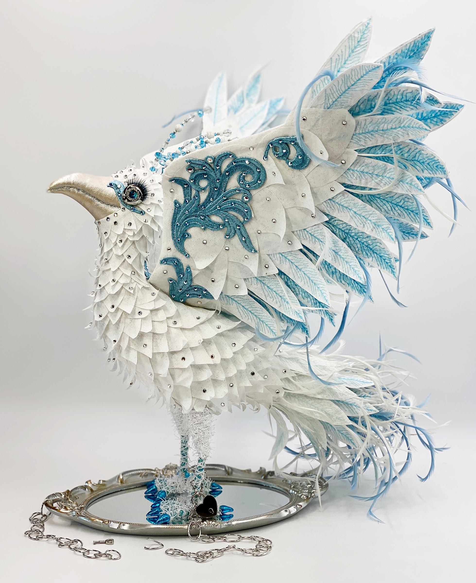The trapped bird dreams of freedom. After eons chained to a gilded mirror, trained to obey the expectations of her kindly but oblivious masters, the shimmering white phoenix finally breaks her chain. She smiles as she lifts her wings skyward, in control her own fate at last. The white phoenix represents all of us who break from our public images to become our true selves. It represents children who assert their independence, and artists who follow their own creative muses instead of conforming to popular trends.