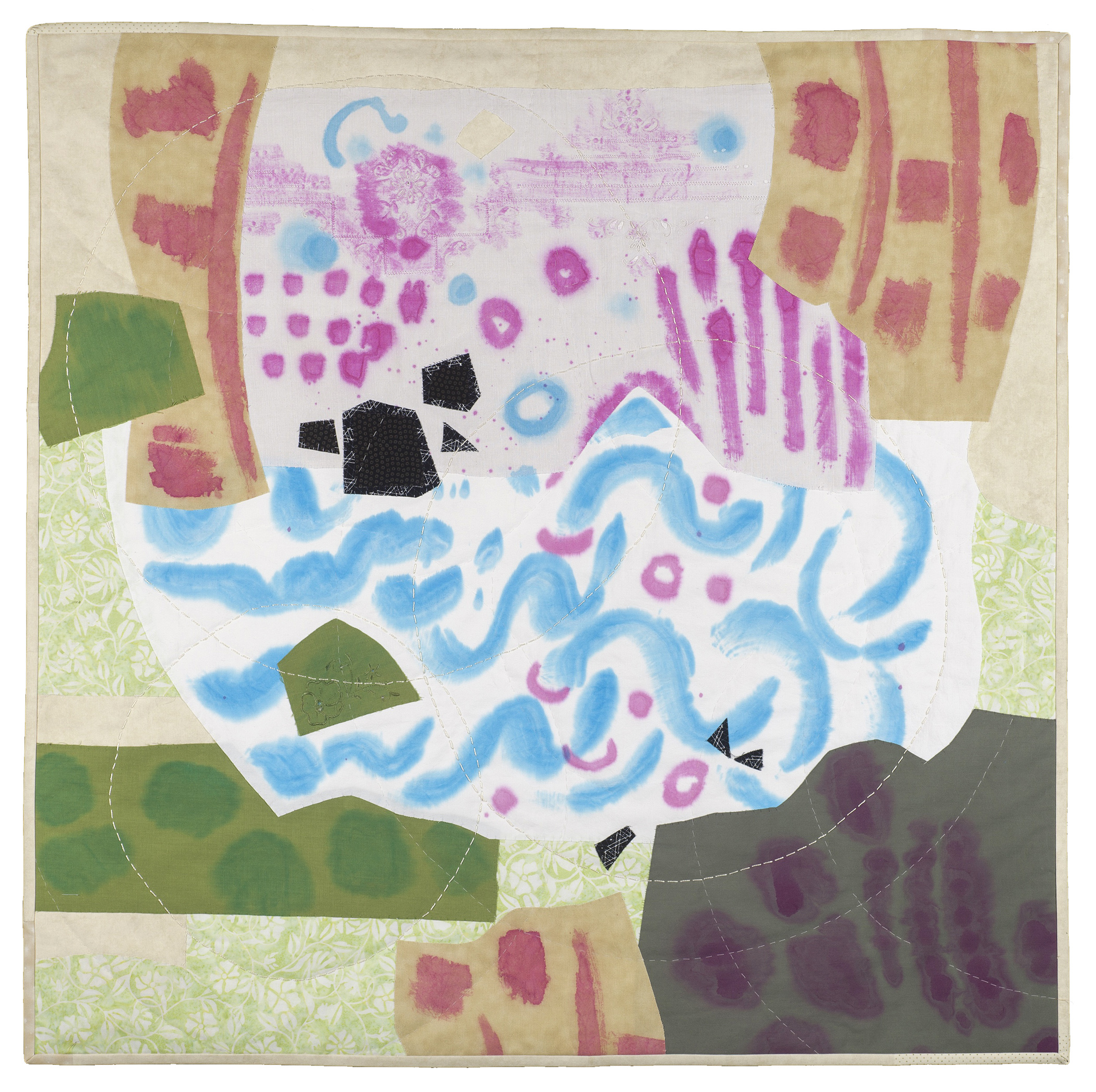 I spent most of 2020 feeling a combination of hope and fear. I painted turquoise and fuchsia on white fabrics to show a hopeful reality. As I composed abstract parts, I began to see a tree reaching for the sky and tree trunk rooted. The black fabrics depict fear.