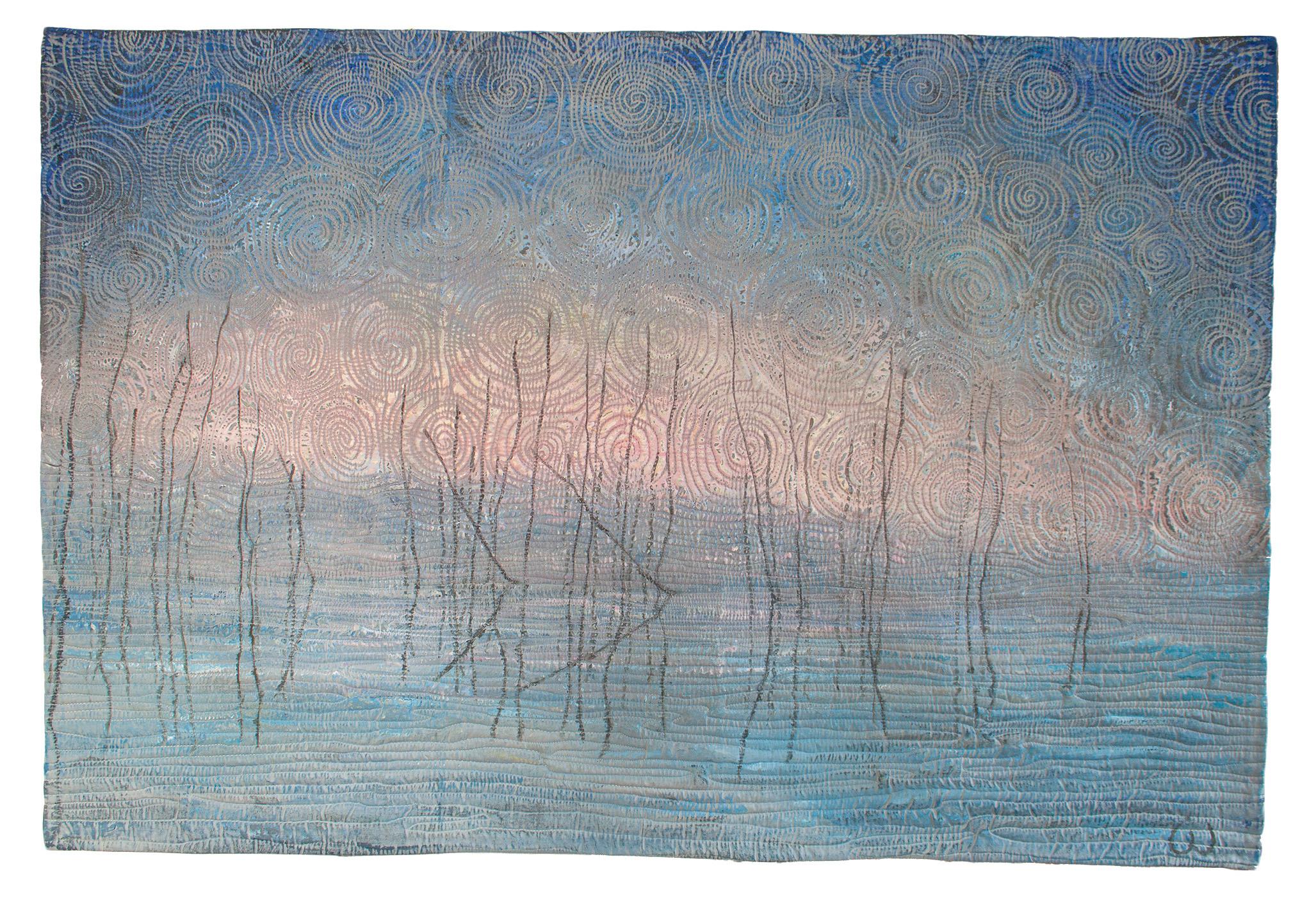 In this work the layers of paint on a stitched surface, allow different colors to emerge and to give the viewer a special impression of the morning light.