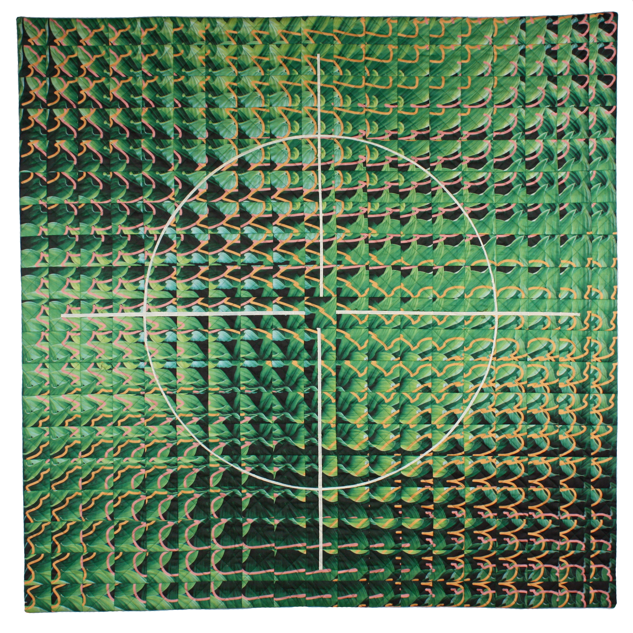 I saw a plant through a pane of corrugated glass. The leaf shapes were divided in many small unconnected pieces. I pondered how to replicate this effect in a quilt. Using multiple copies of a print, I divide each into many squares (no two exactly alike). When the squares are sewn together, the design appears to move across and down the surface of the quilt.