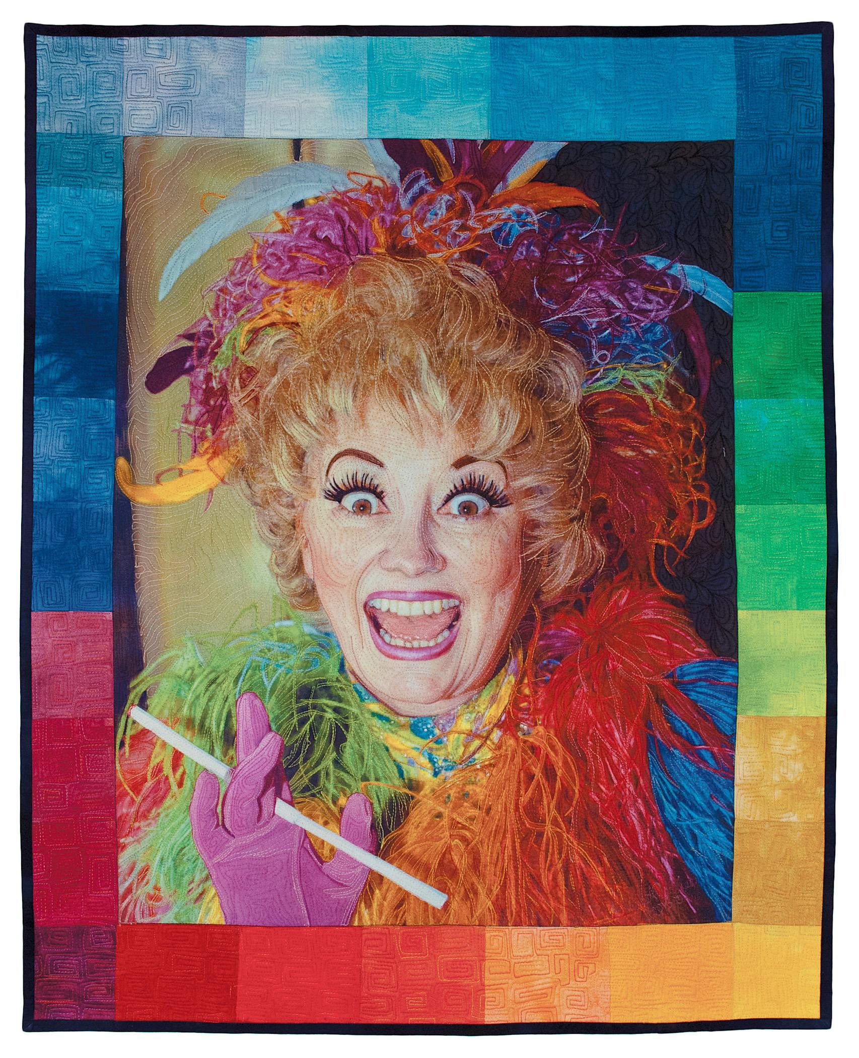 Phyllis Diller was a female pioneer in stand-up comedy. Born on July 17,1917 in Ohio and lived to the age of ninety-five. She was courages and brought laughter to our family living room on the new color TV in the 1960's to 70's. I admired her creative style in wardrobe and color schemes which appeals to my personal choices in creating art. This connection influenced the idea to render an Art Quilt. One of her most famous images that was photographed by British Photographer Allan Warren 1973 "Phyllis Diller" who graciously gave me permission to create this rendering and publish the art work in the book "Herstory Quilts, A Celebration of Strong Women" by Susanne Miller Jones. Phyllis, known for her one-liners wearing orange next to red, became my idol as a pre-teen and ironically we share the same birth day.