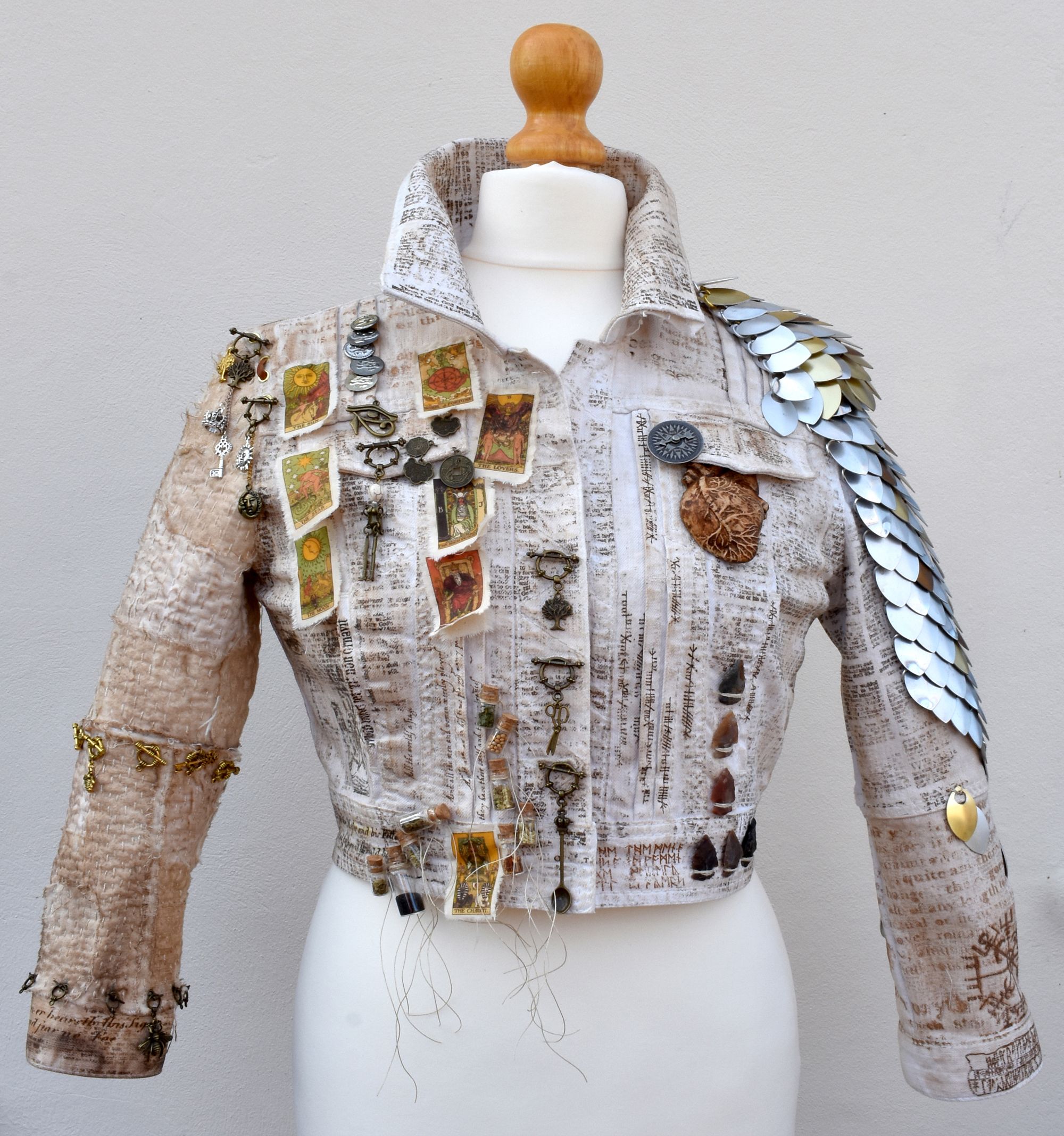 Recycled denim jacket, cotton, bamboo wadding, found objects, metal scales, Fimo