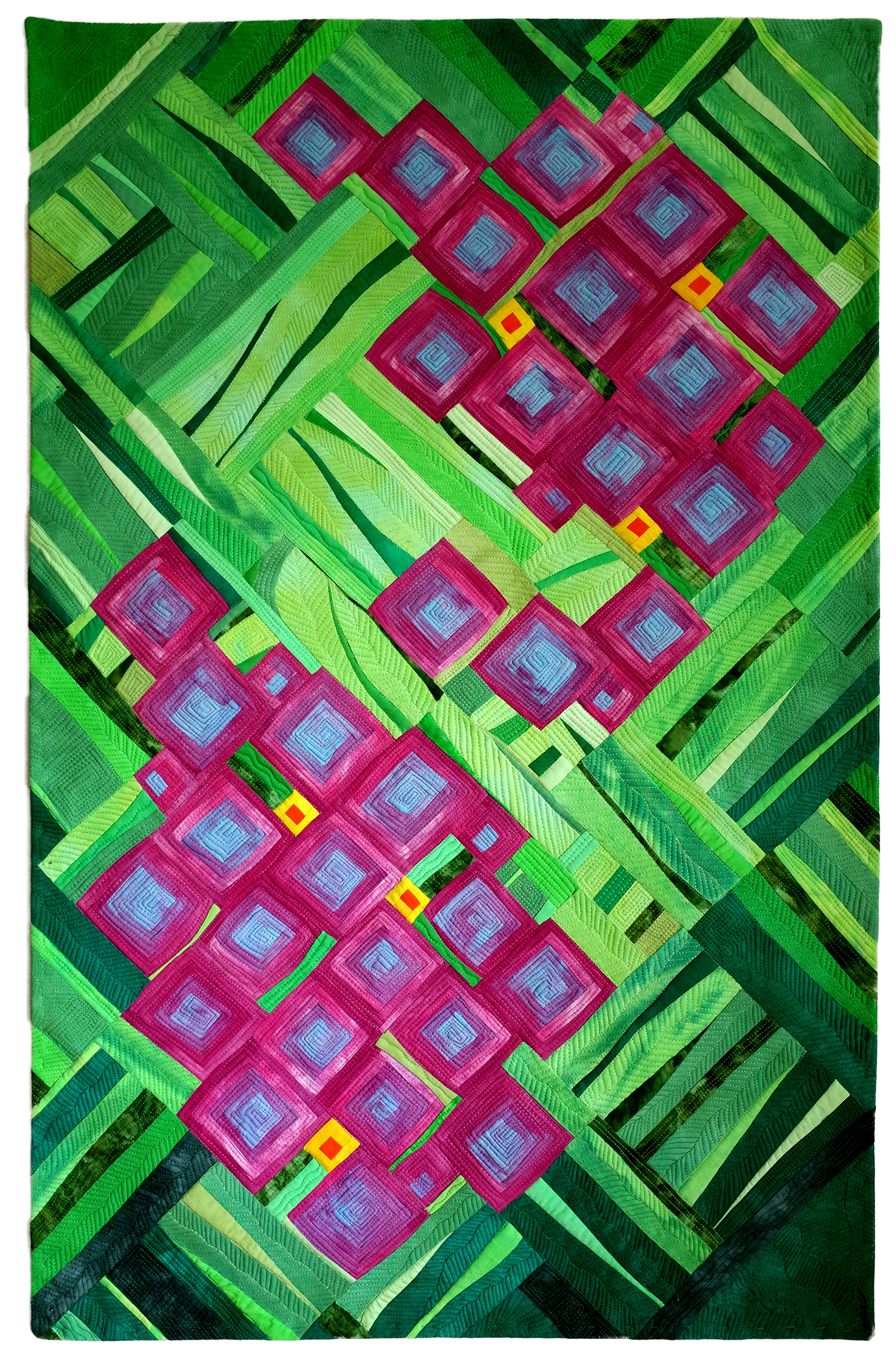 An inspiration for this quilt came from a photo of a blooming hydrangea plan. I used an improvisational log cabin block to make flowers. Squared flowers? Yes! I experiment with this kind of block in my Log Cabin series but instead of making a traditional log cabin block I work improvisationally and find it rewarding.