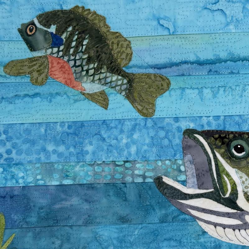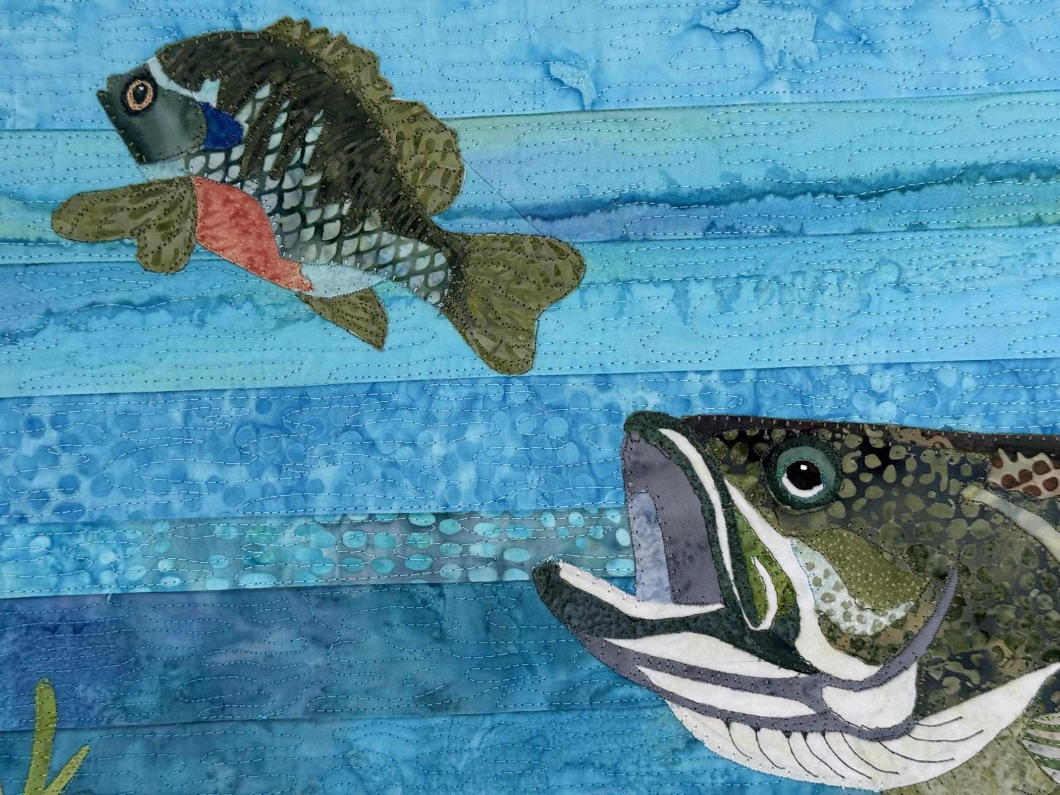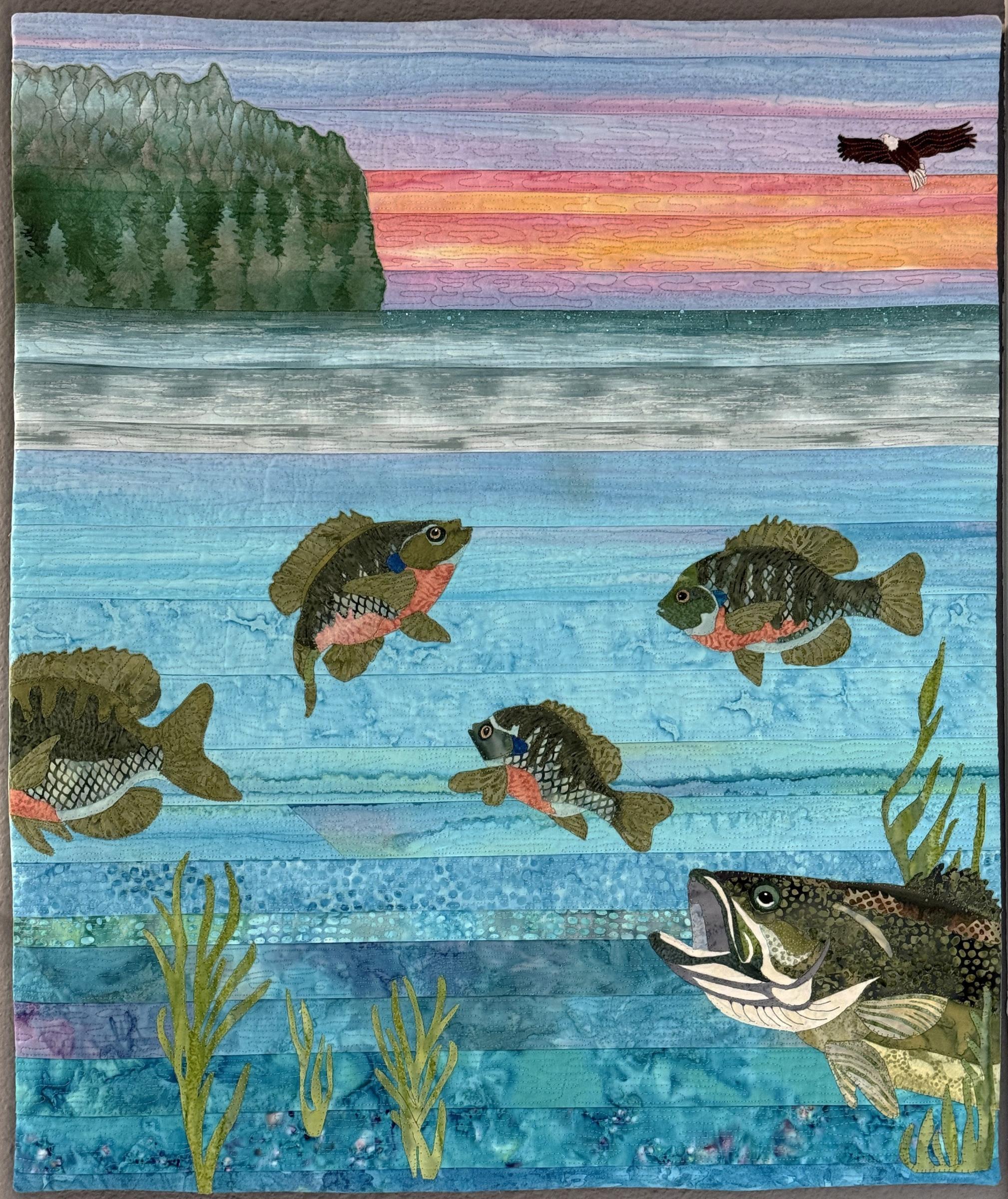 As I sit on the deck of my home, I enjoy the beauty of the sunrise over the water, the shoreline, and the birds. And I ponder and wonder... what's under the surface. I have been snorkeling and know the beauty below the surface, the vibrant colors of the fish. However, I also fear the predators. I chose to show the beauty of the life below the surface.