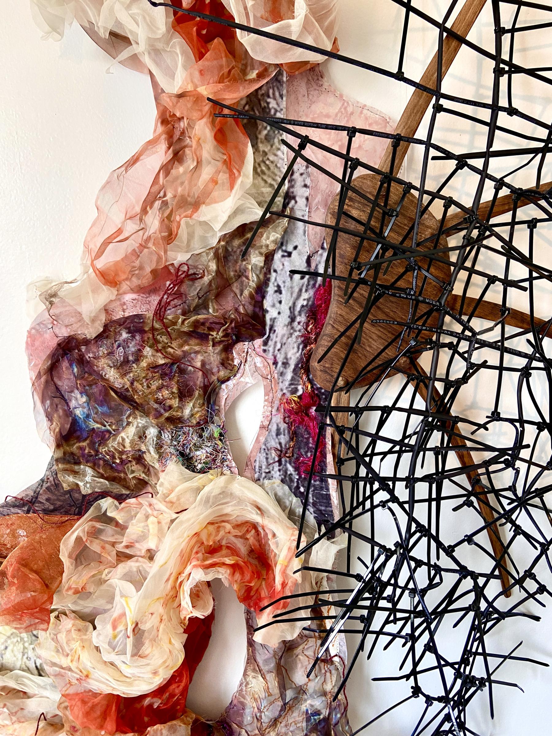 organza, polyesther fabric, plastic, wood, heat-shrinkable tubing, hose clamp, paper, woven stainless steel, various threads