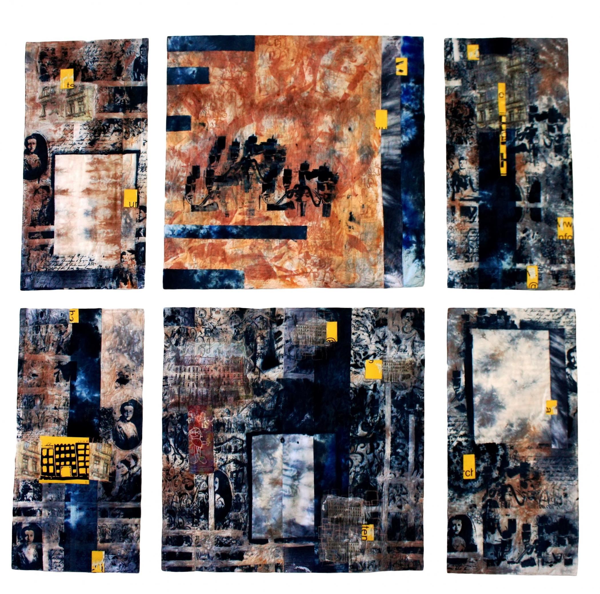 Hand-dyed cotton, old flea market finds like photos, printing tools, laces and papers, teabags, organza, digital photos, poster scraps from the “Wächterhäuser,” cotton and rayon thread
