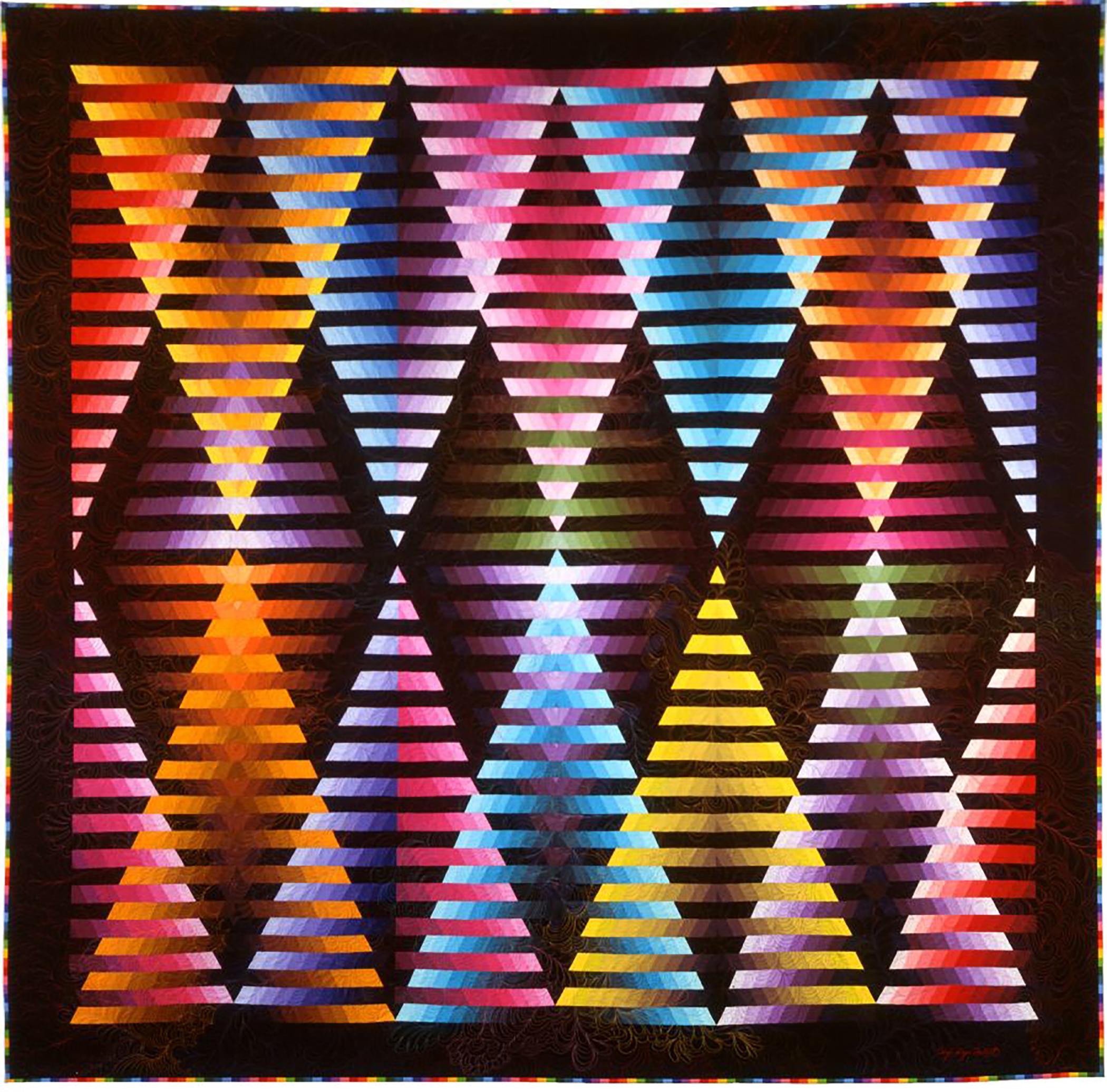 This is one of a series of quilts, exploring the illusion of overlapping transparent triangles. The triangles were pieced from strips of fabric, hand dyed in value (light to dark) gradations of the three primary colors (Turquoise, yellow, fuchsia), and the three secondary colors (green, orange, purple). Each triangle was pieced separately and then cut into horizontal strips. The strips of two triangles were alternated when they were sewn back together. This creates the illusion of more than one triangle occupying the same space. As the groups of triangles were sewn together, the illusion of long vertical diamonds appeared in the background. In contrast to the geometry of the pieced design, the quilting was done in a freeform, swirling, organic design, using shiny rayon embroidery thread in many colors. All of the machine quilting was done freehand, with no marking of the quilt top. The original design for this quilt was drawn, using Corel Draw, a computer assisted design program.