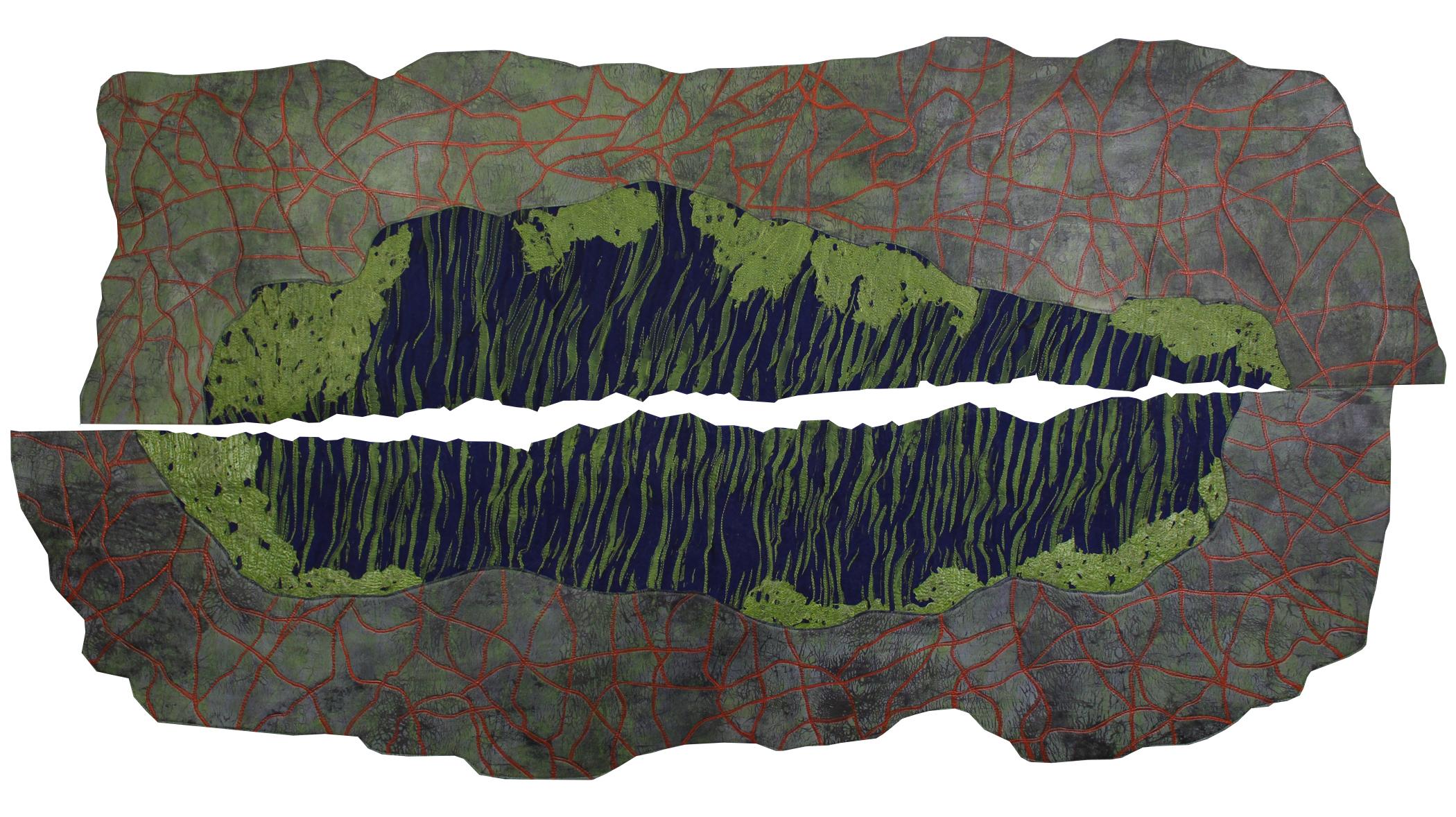I live on the western edge of a watershed that drains seven million acres in Ohio, Michigan, and Indiana into Lake Erie. Fertilizer runoff from farms and residential lawns has often resulted in the development of large algae blooms in the lake, harming fish and other aquatic life and endangering the water supply. This piece is an attempt to portray the massive imbalance in the natural environment of this area which occurs as a result of this dynamic.