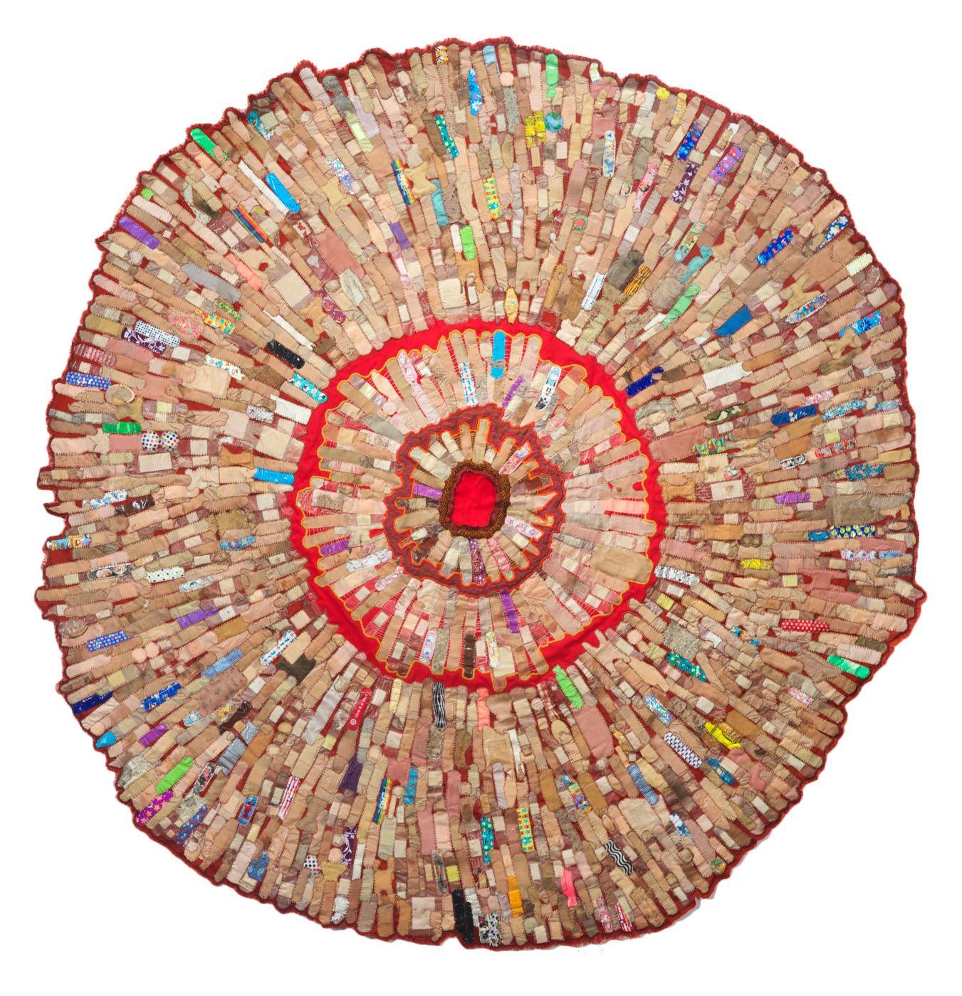 This is the 4th in a series of mandalas. After literally being locked out of my home, I did not know where to go. Using found band aids, symbolic of wounding and resilience, I looked within to find the center (the heart) I had lost. I stitched together my life, a new story, a stronger map to lead me on my next journey towards home.