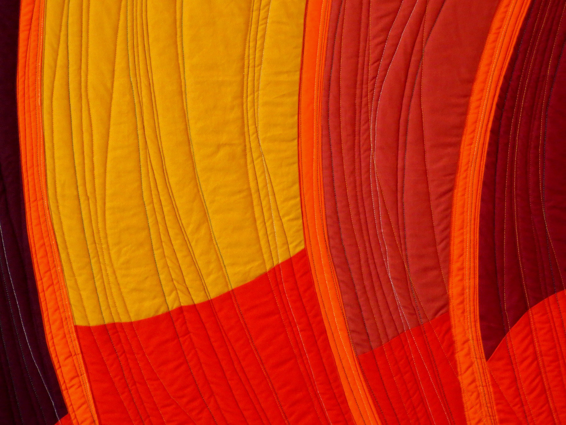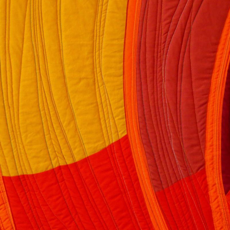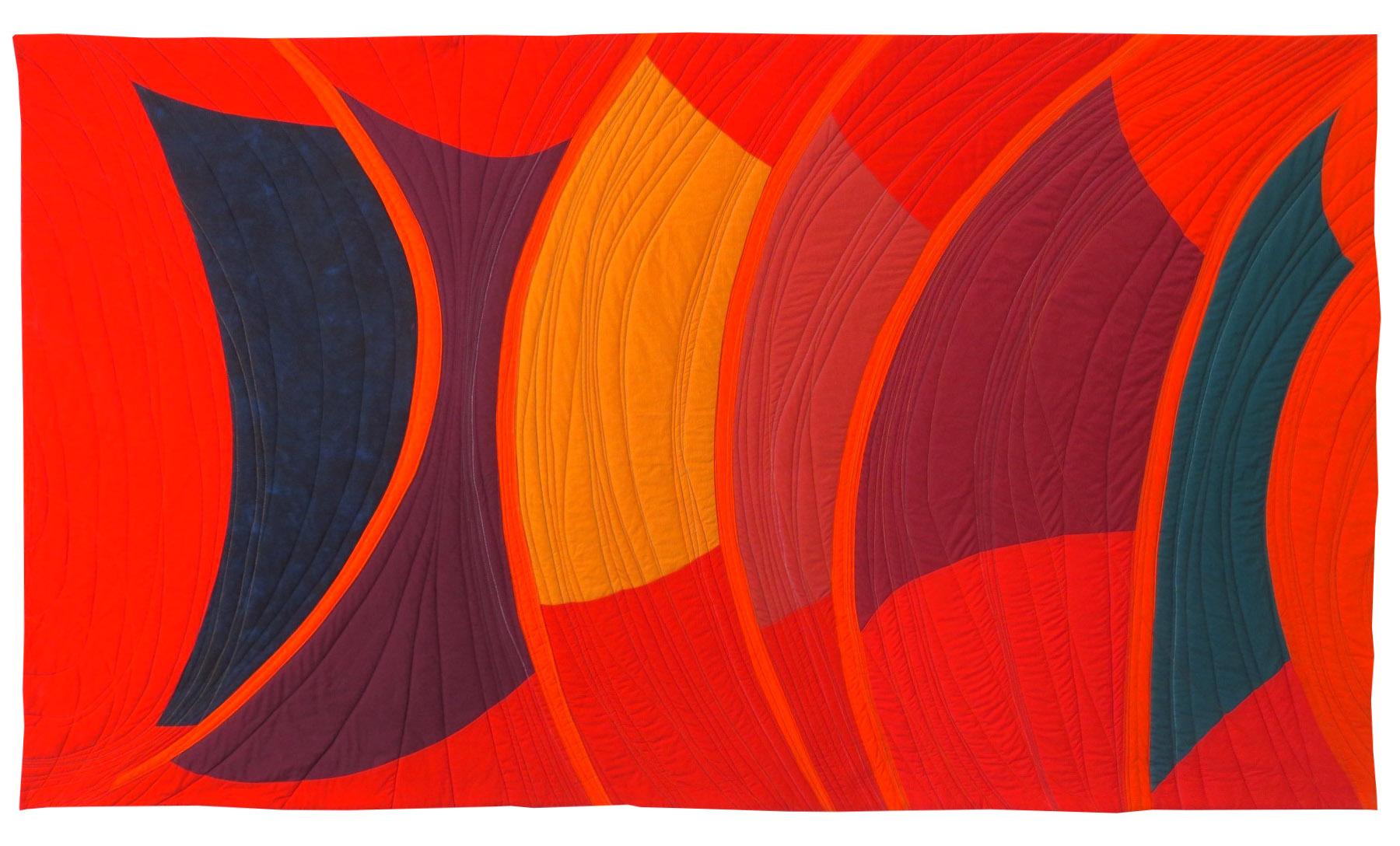 To sever curving convex shape from concave shape, entire areas of color are segmented by narrow strips. These muscular images have a pattern of bold, hand cut curves. Accenting their volumes in thread highlights their forms.